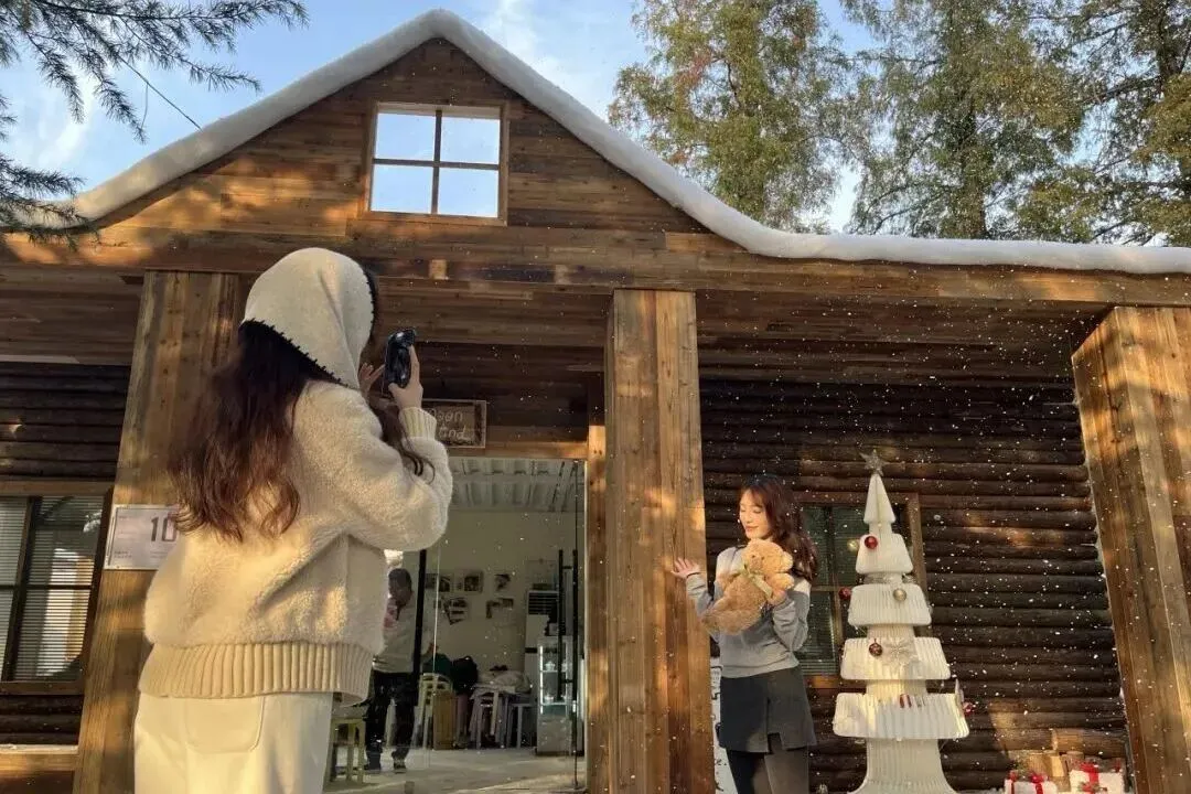 整点时分,屋顶的迷你泡泡机悄然启动,“雪花”便簌簌落下,纷纷扬扬,缀满屋檐与庭院。