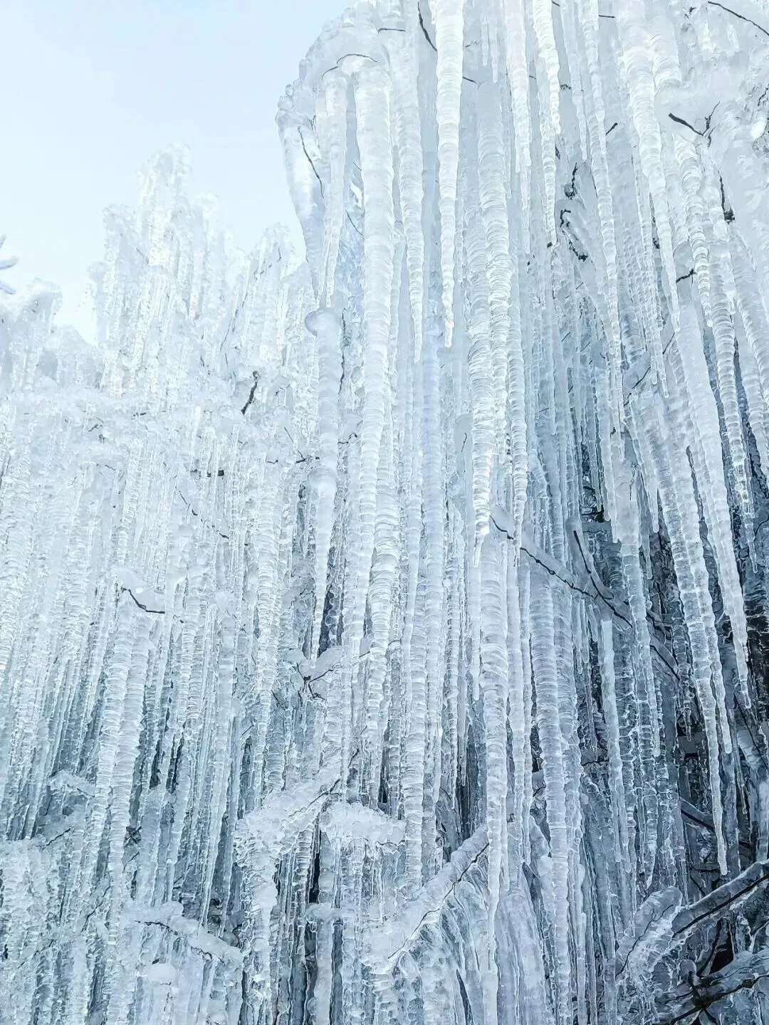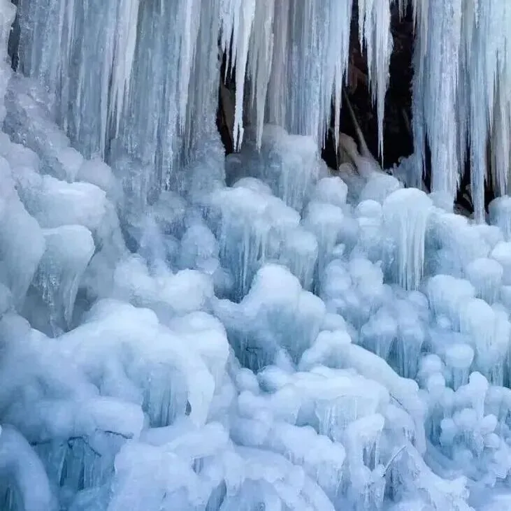 踏入景区,一片磅礴的冰瀑群瞬间夺走所有目光——奔腾的瀑布在冬季凝住,化作一整面洁白的玉帘。冰层叠叠积压,纹理分明;冰帘垂落参差,似梦似幻,仿佛一段银河在此具象成冰。