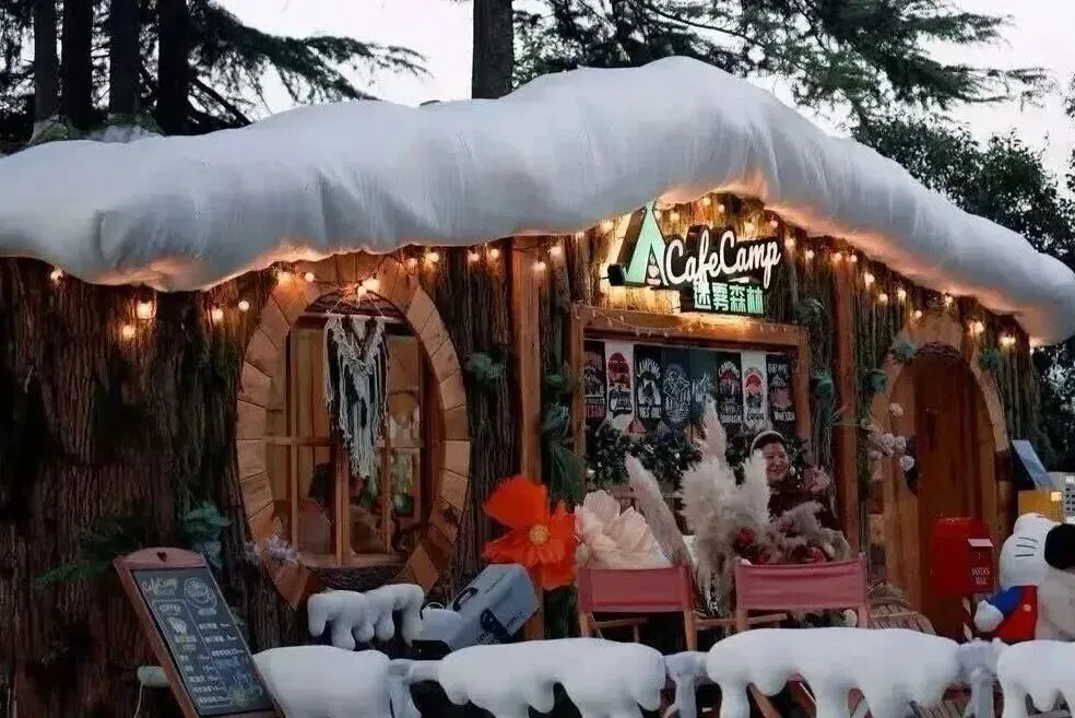 在嵩县陆浑湖国家湿地公园旁,饭坡镇南庄村的林荫深处,静静“藏”着一座被几棵老松温柔环抱的咖啡屋。蓬松的白色篷布仿佛积雪轻覆屋顶,地面铺就的白沙则带来如踩粉雪般的柔软触感——这里已悄然变身浪漫的森林雪屋,冬日氛围瞬间满格。