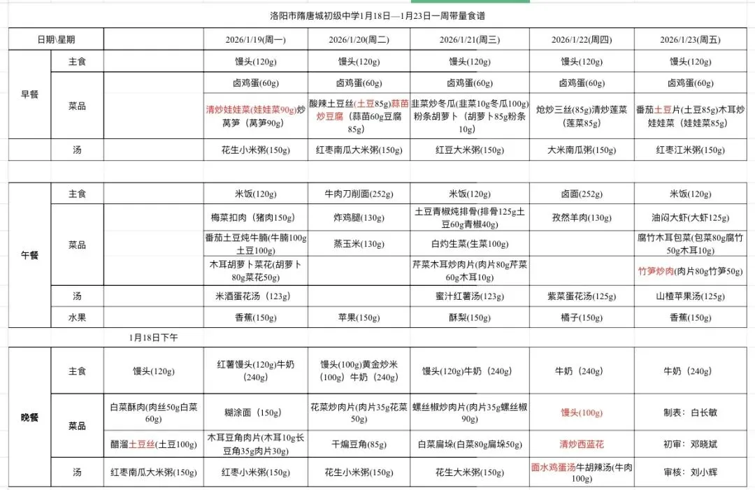 为了保证在校师生每日营养摄入量,洛阳市隋唐成初级中学严格按照每日的膳食推荐摄入量为师生们制定了食谱,让师生们的每一餐都吃的营养,吃的健康,吃的安心!