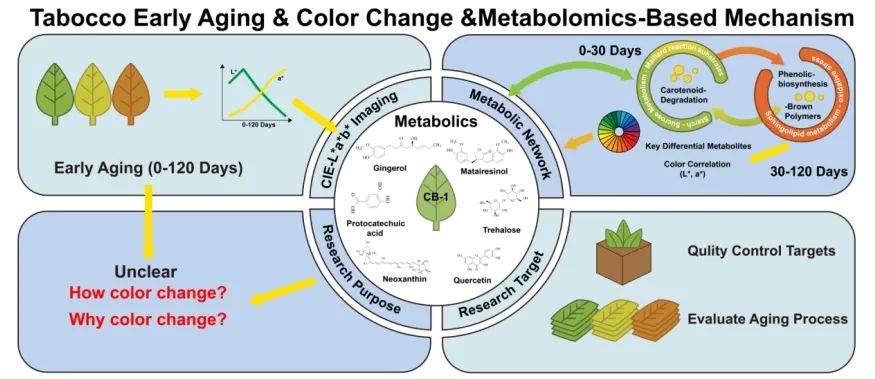 该研究聚焦于特色烤烟品种“翠碧一号”在醇化前期(0-120天)的颜色变化机制。通过采用多组学技术耦合图像处理方法,系统构建了反映醇化前期烟叶颜色演变规律的代谢网络。研究发现,醇化过程中烟叶颜色呈现规律性变化:烟叶颜色从初烤结束到醇化30天显著提亮,呈鲜亮黄棕色,30天后逐渐向更深、更偏红的黄褐色转变,直至120天。具体表现为亮度(L*)值和黄度(b*)值先上升后下降,红度(a*)值持续上升。构建的代谢网络以糖类代谢为核心,下游连接酚类、黄酮类、鞘脂类、萜类代谢,同时鉴定出 16 种关键差异代谢物,其积累变化与颜色参数呈显著相关。进一步阐明糖类消耗、类胡萝卜素降解及酚类与黄酮类物质积累的协同作用,共同驱动了醇化前期烟叶的颜色转变。该研究首次从代谢层面揭示了“翠碧 1 号”烟叶前期醇化过程中颜色变化的内在机制,为科学评估烟叶醇化进程、保障高价值烟草原料品质提供了全新见解。