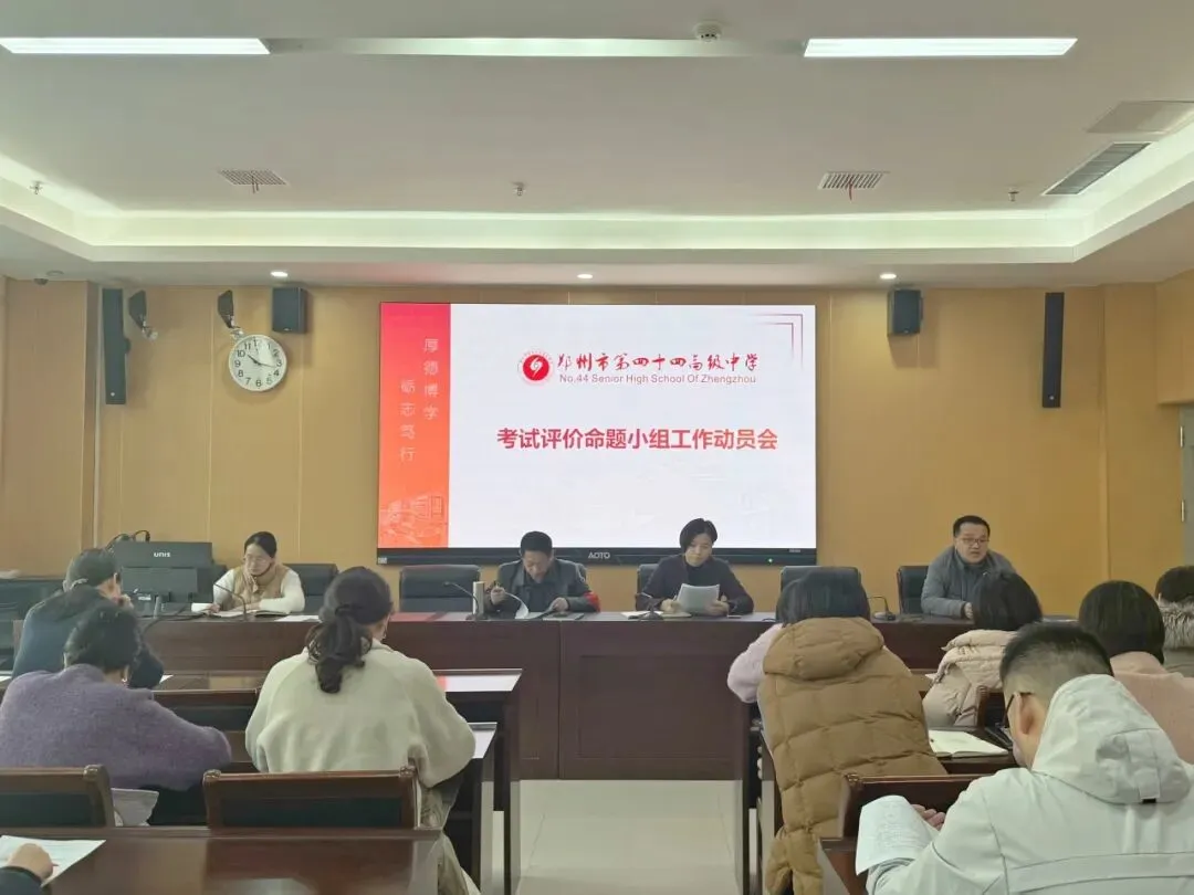 为筑牢考试评价根基,确保期末命题科学规范、精准赋能教学,郑州市第四十四高级中学召开考试评价命题小组工作动员会。校党委书记贾洪波,党委副书记、校长王瑞芳,教务处主任于威、副主任丁金凤,以及各学科命题、审题、保密教师参会,凝聚合力为命题工作保驾护航。