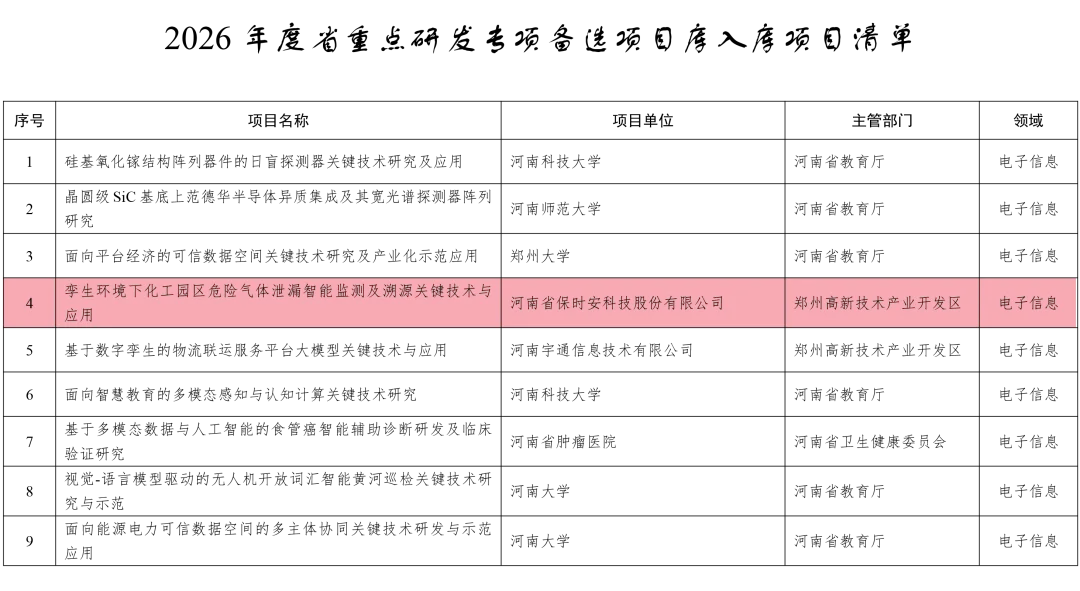 为提升有组织科研的体系化能力和水平,强化项目库建设,根据《河南省科学技术厅 河南省财政厅关于组织申报2026年度河南省重点研发专项的通知》,经自主申报、部门推荐、评审论证等程序,省科技厅将117个项目纳入2026年度省重点研发专项备选项目库,郑州亿达科技新城园区企业河南省保时安科技股份有限公司成功入选。