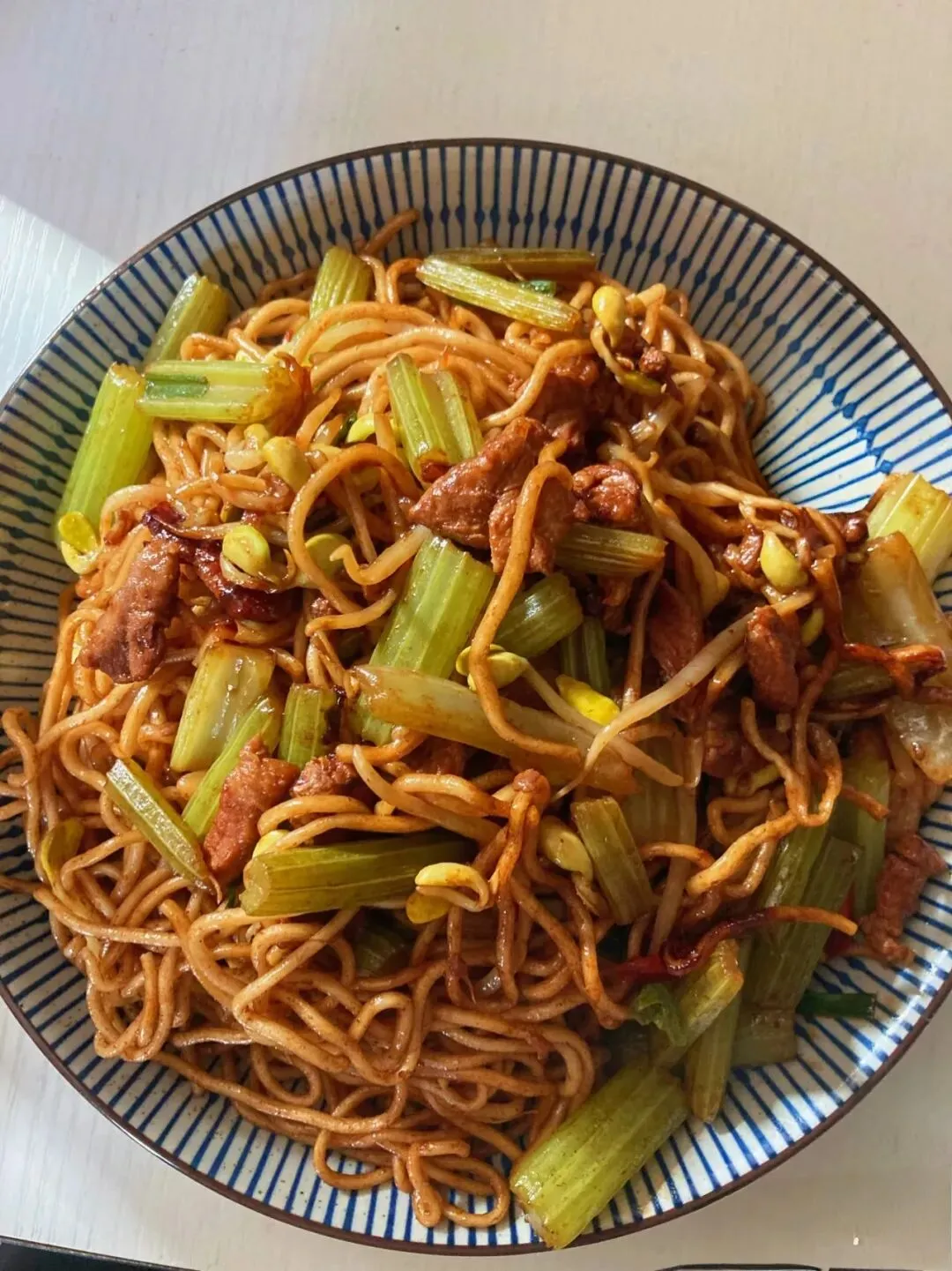 (宽卤面180克,芹菜60克,猪肉50克,胡萝卜20克,黄豆芽75克)