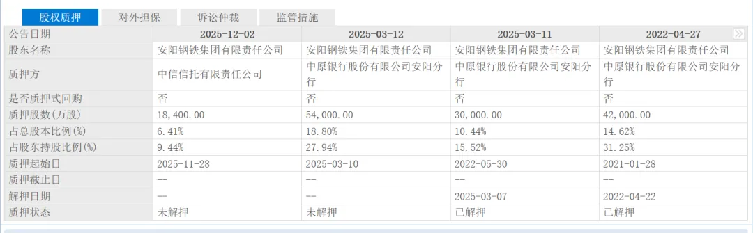 ● 安阳钢铁集团有限责任公司自2025年11月28日起质押1.84亿股,占所持股比例为9.44%,占总股本比6.41%,累计质押9.74亿股,占所持股比例为49.97%,占总股本比33.91%。