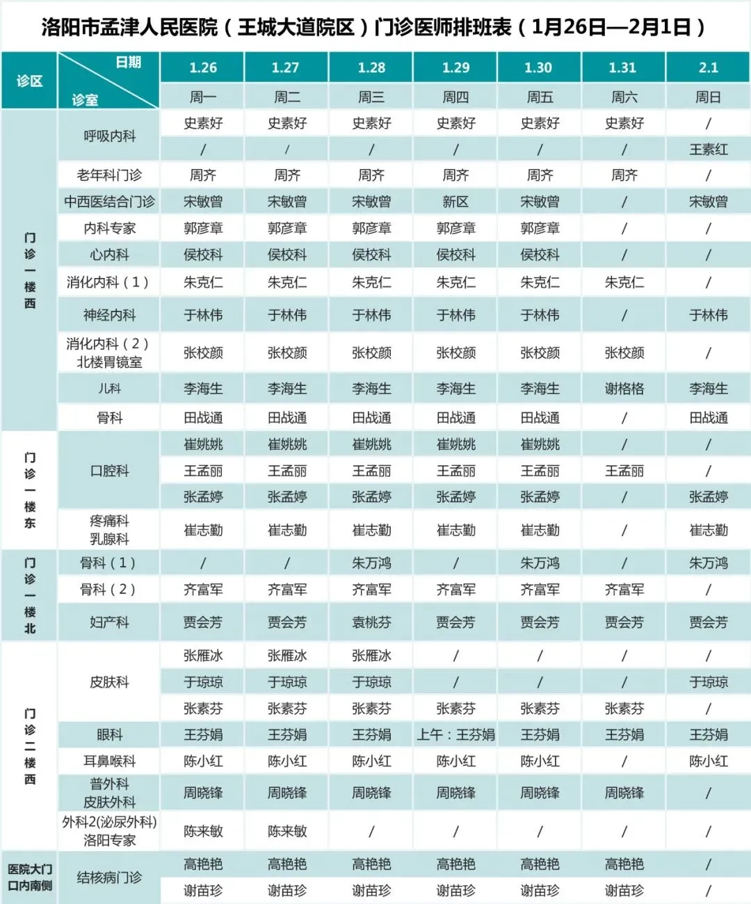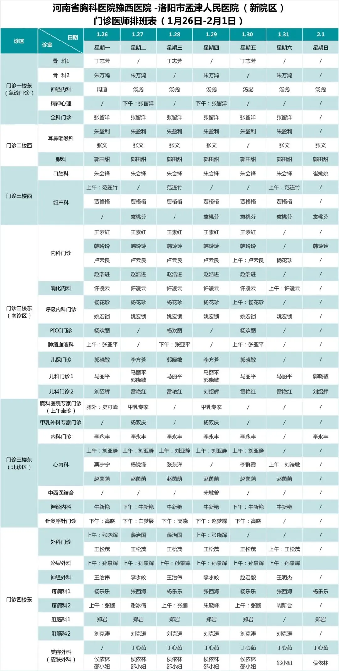 门诊医师或因特殊情况临时调班,您可于就诊当日到“健康洛阳”预约平台查看实时排班。