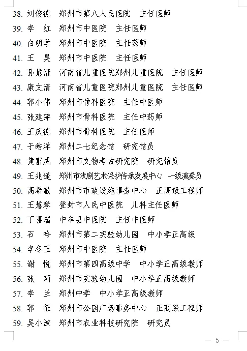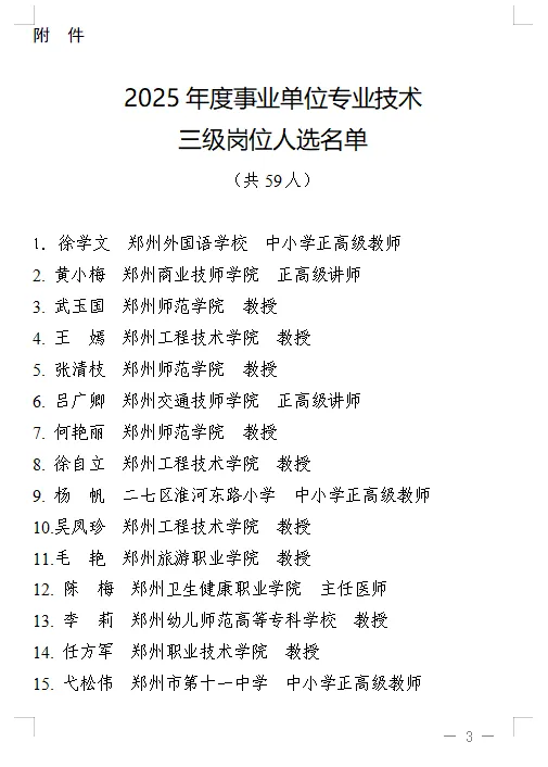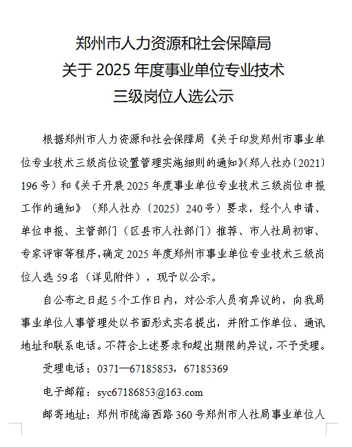 根据郑州市人力资源和社会保障局《关于印发郑州市事业单位专业技术三级岗位设置管理实施细则的通知》(郑人社办〔2021〕196号)和《关于开展2025年度事业单位专业技术三级岗位申报工作的通知》(郑人社办〔2025〕240号)要求,经个人申请、单位申报、主管部门(区县市人社部门)推荐、市人社局初审、专家评审等程序,确定2025年度郑州市事业单位专业技术三级岗位人选59名(详见附件),现予以公示。