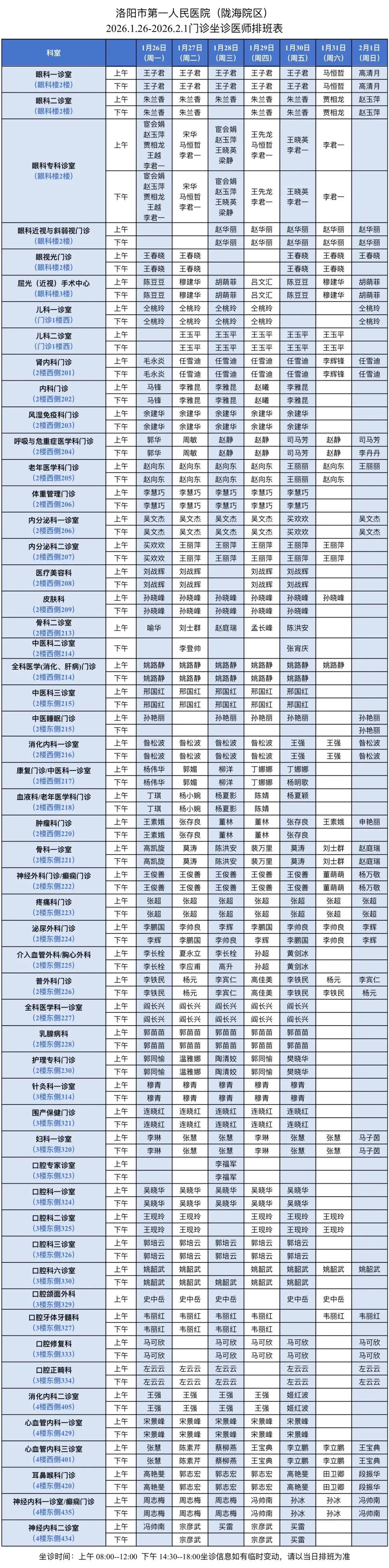 门诊坐诊医师排班表