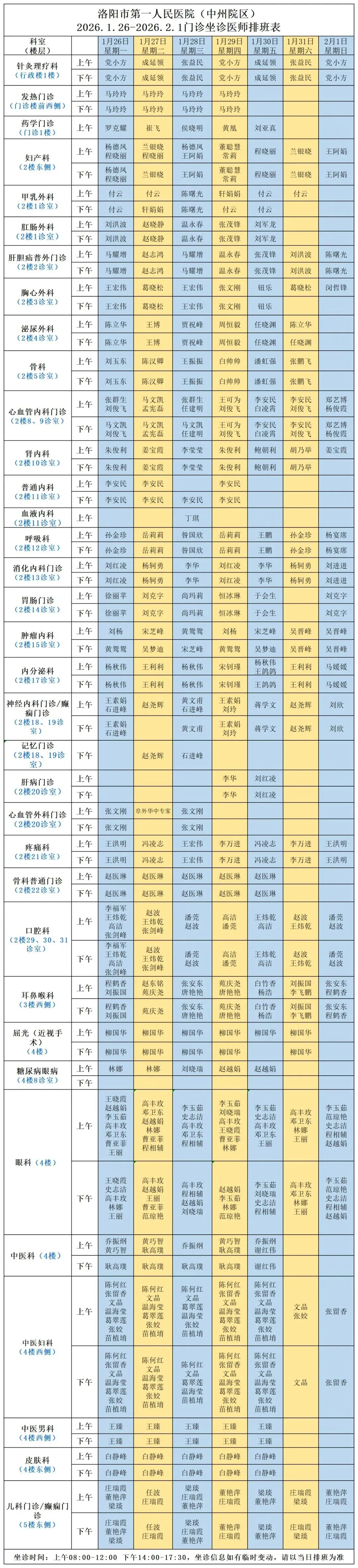 中州院区门诊排班表
