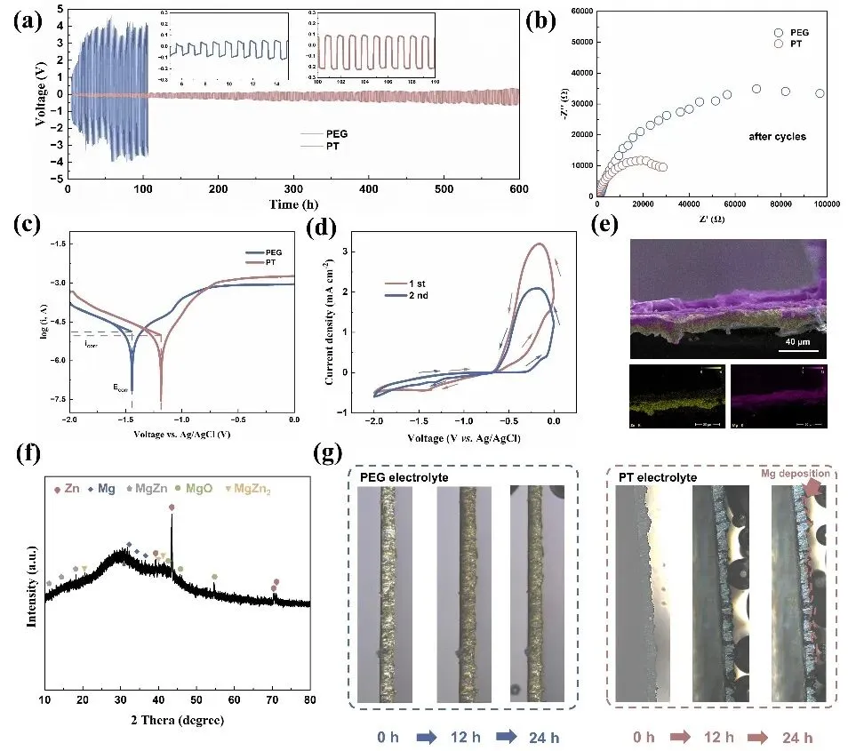 图1:电解液性能对比。(a) Mg||Mg 对称电池在 PEG 和 PT 电解液中的循环性能:PT 电解液过电位显著降低,循环更稳定。(b) 电化学阻抗谱(EIS):PT 电解液中界面阻抗更低。(c) Tafel 曲线:PT 电解液中腐蚀电位正移,腐蚀电流降低。(d) 在 Zn 电极上的 CV 曲线:显示镁沉积/剥离的可逆性。(e, f) SEM/EDS 和 XRD 分析:证实镁在 PT 电解液中沉积并形成含 Mg、MgO 的层。(g) 原位光学显微镜观察:PT 电解液中可见黑色镁沉积物,PEG 中则无沉积。