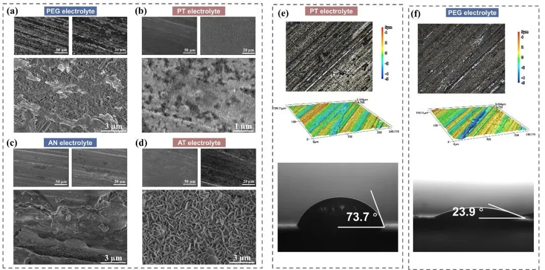 图2:界面形貌与润湿性。(a-d) SEM 图像:PEG 和 AN 电解液中镁表面出现蜂窝状腐蚀坑,PT 和 AT 电解液中则形成致密层状界面膜。(e,f) 共聚焦显微镜与接触角测试:PT 电解液中镁表面更疏水(接触角 73.7°),表明界面膜具有保护性。