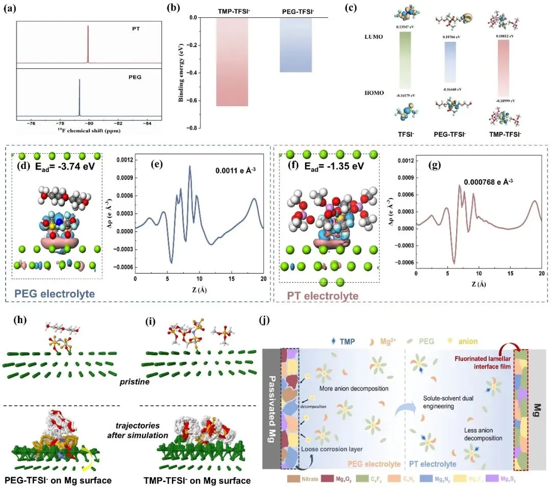 图4:溶质-溶剂相互作用的理论与模拟。(a)19F NMR:PT 电解液中TFSI-的 F 原子电子云密度增加,表明 TMP与TFSI-强关联。(b) 结合能计算:TMP-TFSI-结合能低于 PEG-TFSI-。(c-i) DFT与AIMD 模拟:TMP-TFSI- 在镁表面吸附能更高,分解更少;PEG-TFSI-易完全分解形成硝酸盐,导致钝化。(j) 示意图:PT 电解液中形成氟化保护膜,PEG中形成腐蚀性钝化层。
