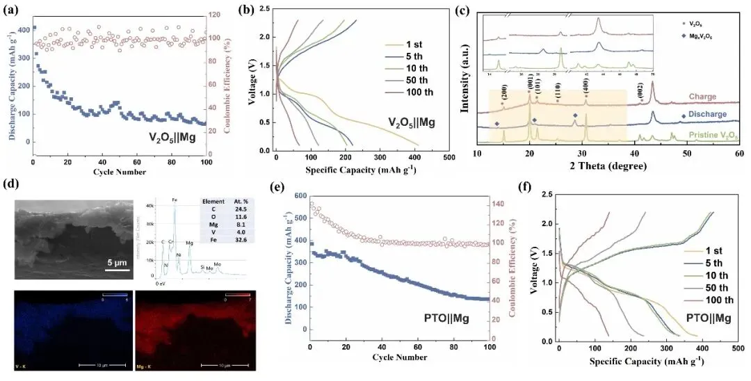 图5:全电池性能。(a, b) V2O5||Mg 全电池:循环 100 圈后容量 66.9 mAh g-1,库仑效率 106.2%。(c, d) XRD 与 SEM/EDS:证实 Mg2+ 可逆嵌入 V2O5 晶格。(e, f) PTO||Mg 全电池:初始容量 380 mAh g-1,循环后保持 138 mAh g-1,放电平台 1.25 V。