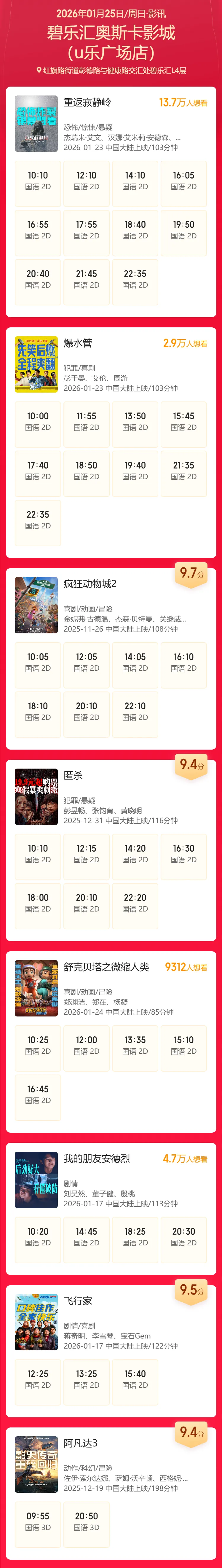 安阳碧乐汇奥斯卡影城1月25日影讯(影讯仅供参考,具体排片以影院当日播出为准)