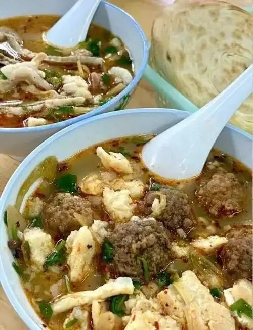 中午牛肉汤或羊肉汤配烧饼,先喝汤,再下馍,肚子很稳。