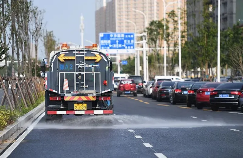 8月23日,环卫车在郑州市金水区丰庆路作业