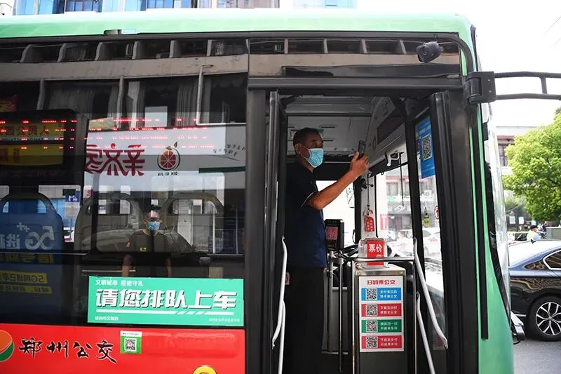 8月23日,市民在郑州市二七区二七路登上公交车后扫码登记