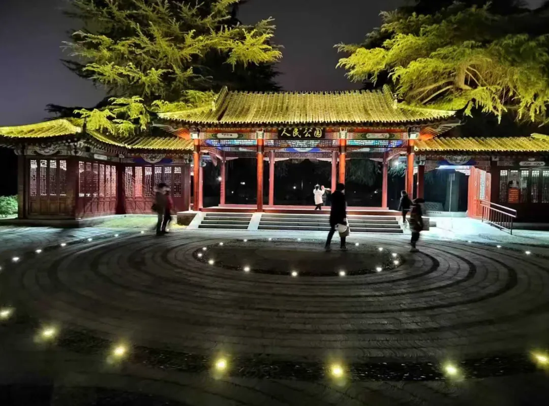 人民公园的古建、植被、水景在分层亮化技术下,光影层次丰富,一步一景;