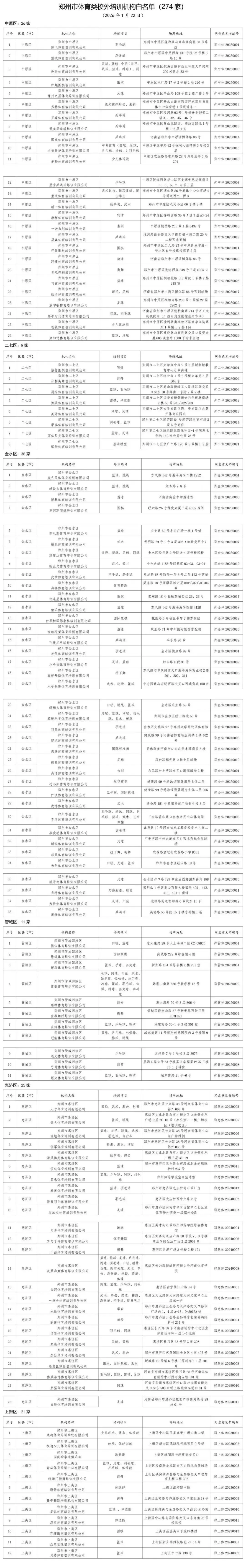 2026年寒假将至,1月22日,记者从郑州市体育局获悉,为严格落实国家“双减”政策,根据《河南省体育类校外培训机构设置标准和管理指南(试行)》和《郑州市体育类校外培训机构设置标准和管理指南(试行)》通知要求,经各开发区和区县(市)体育主管部门审核同意,截至2026年1月22日,郑州市共有274家体育类校外培训机构取得线下培训资质,现予以公布(详见附表)。