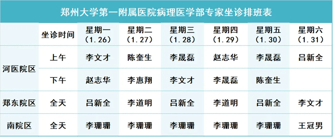 郑州大学第一附属医院病理医学部1.26--1.31三院区专家坐诊信息