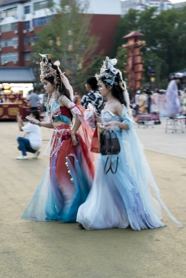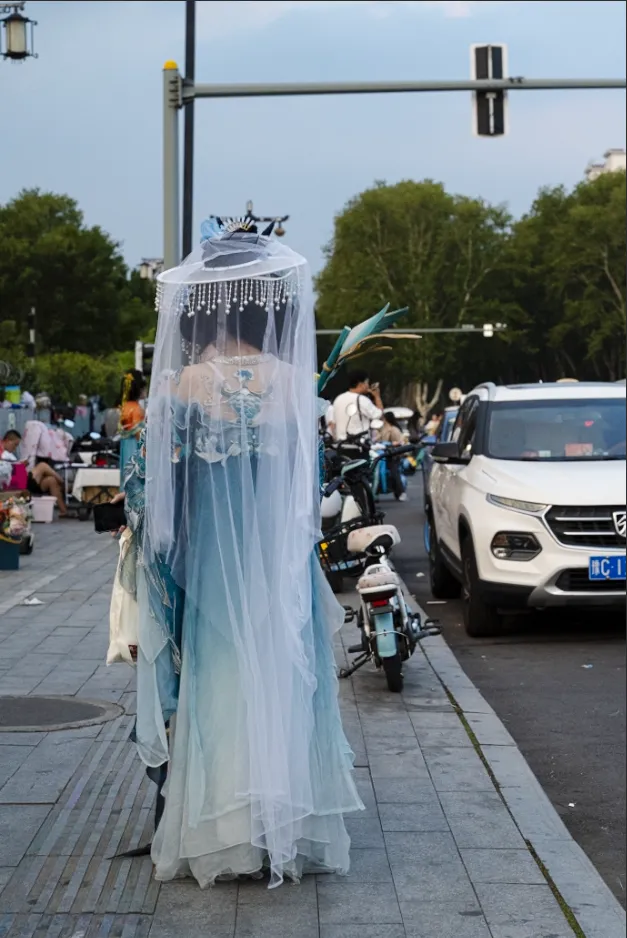 可能是看我拿着相机在拍照,就有路人来问我,是不是拍汉服的师傅,还有人直接问我拍照怎么收费,而他们都已自带服装和妆容了,这突然被问到还挺不好意思的。看这应天门附近熙攘的人群,确实有很多姑娘都是盛装打扮出来的,尽管太阳已经不见了踪影,是眼看着天灰蒙了起来,毕竟这还是炎热的夏季啊,热还是热的。这么多的类型里,比较喜欢这对类似飞天舞的服装,更清凉;但最喜欢带帷帽的那款,更有窈窕婉如玉的感觉。这种起源于南北朝时期西北游牧民族的“幂篱”,从最开始的全身遮蔽,演变到高顶宽檐的笠帽,垂纱至颈脖部位,反而成为了时尚。传说王昭君出塞时佩戴过,所以又称“昭君帽”,其核心就是在帽檐四周垂挂上网状织物,用以遮蔽面容,能防晒防风防沙防尘又防虫。从因礼教强化要求使用的物品,慢慢演变成了日常穿戴的功能性饰物,是文化自信的另一种表现吧!只是随手拍,有些拍到了正面照的就删除了,侧重点还是看服装,虽然服装也没有拍好