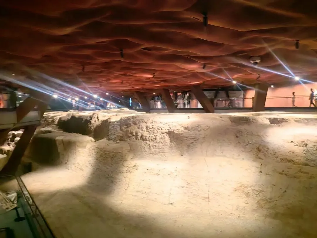 小程序上买好门票,就准备排队进入遗址层参观,一楼的厅内还有一个唐宫乐宴演出,配有服装看演出,需要另外购票,我儿不感兴趣,就放弃了。进门后检票上楼,看到公益讲解员就紧紧跟随其脚步一路听讲,好学生一枚。