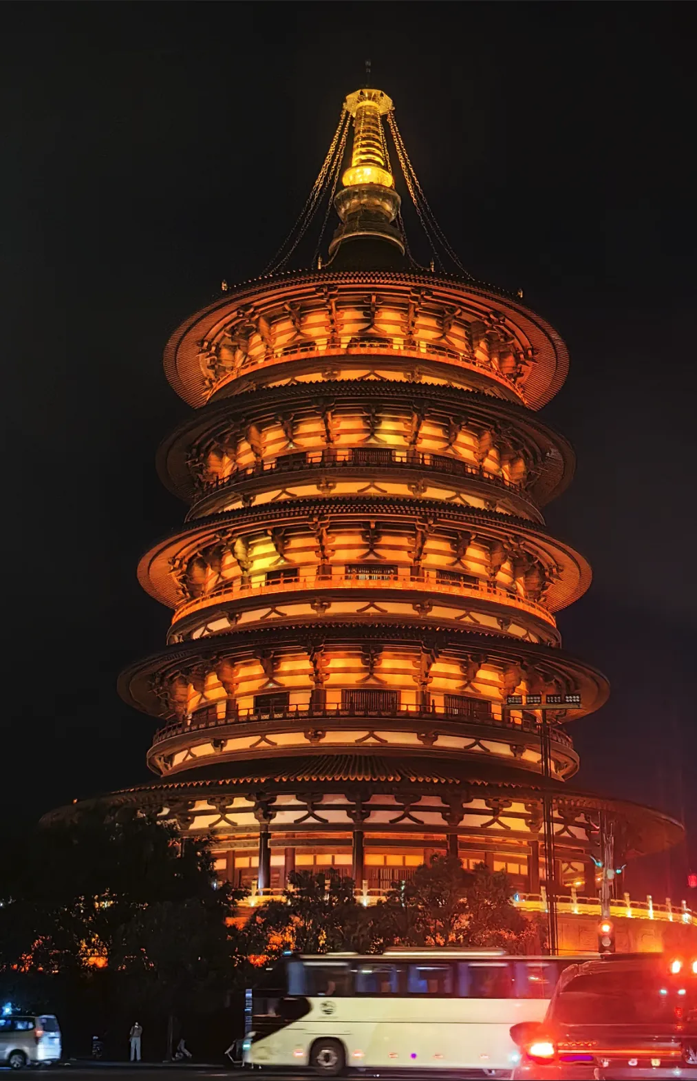 激光投影下看到的盛唐在夜晚彩灯映衬下还是令人怀想的。遗址之上,唐代城门、墩台、门道路土、城垣、马道、砖铺道路等与北宋宫殿建筑基址、水渠、花坑等遗迹上下叠压。考古资料显示,玄武门东西宽约35米,为单门道过梁式建筑结构,两侧城门墩台东西与城墙相接,城墙内侧有东西长约50米的直坡式马道。直到北宋时期,玄武门被废弃。直到转完整个遗址我才反应过来,整体钢结构的绝纱,原来是为保护这下面的隋唐遗址,用现代的工程技术去完美复原唐代的风貌,妙啊!也是在看完遗址才能理解这座城门的核心结构,就是夯土筑成的墩台,用“版筑法”层层夯实,坚固异常。东西两座巨大的夯土台基,是城门的主体,平面呈长方形,采用夹板填土后用夯头逐层夯实,土质纯净且坚硬。只是现存的东侧夯土墙残高14.5米不等,宽约2米。还有土墙,不同点在于夯层中夹有河卵石,夯层不明显。遗址逛完出来还有唐三彩展区和一些书画展,不想看展就到二层的平台上看景,也可以选择继续登上更高的阙楼位置看城景,且不同时间段会有不同的表演。不知不觉间,等我们逛完出来,整个城市已经亮起了霓虹灯,中轴线上的这些仿古建在夜空下更为璀璨。小夜景来波。晚八点还差一刻钟,被安保和广播提示要退出这个观景平台了,因为8点要开始表演了,要为表演清场了。儿说对表演不感兴趣,我俩就只得出去觅食了。途径北广场,夜色下小摊贩的营业模式开启了,琳琅满目的小手信,赶紧买了一些,大多是唐风式白白胖胖可爱到膨胀的小玩偶和磁娃娃及钥匙扣,欢喜得紧!总结,洛阳是一座适合漫游的城市,只是可惜我儿是个没有口腹之欲的人,所以对洛阳的美食在这次的行程中未能去感受一二,有些小小遗憾。其实每一次的出行,并不在于你抵达了些什么地方,而在乎于抵达的过程中你所遇见的小意外。在这些遇见里学会从不同的视角去看问题,学会在不经意的日常里发现温暖的光,学会在不确定里找到自己的节奏。总之就是让自己的眼里有光,让自己的耳朵也变得包容,嘴里不再有刻薄的语言,脚步也不再匆忙。
