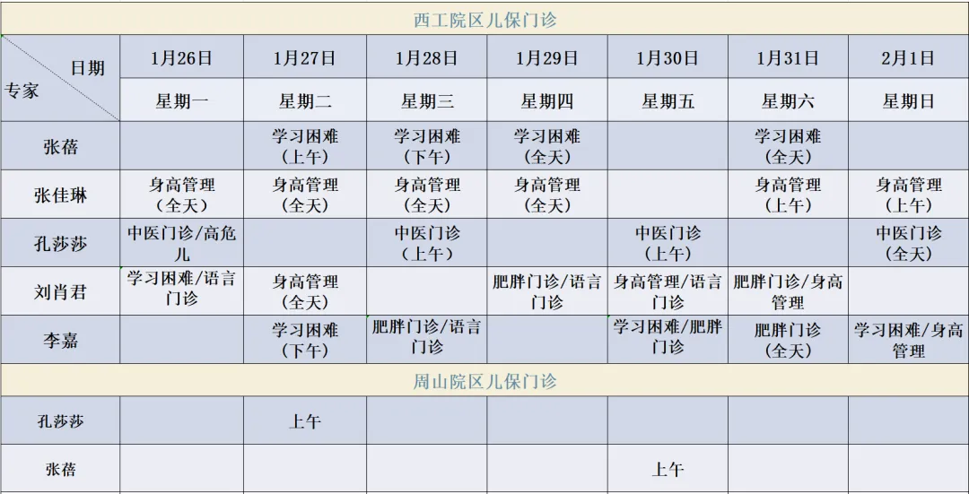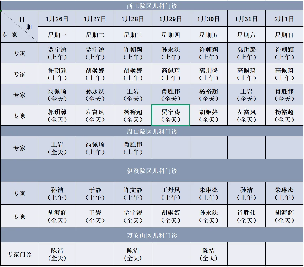 郑州大学附属洛阳市中心医院儿科/儿保门诊2026年1月26日—2026年2月1日专家坐诊时间