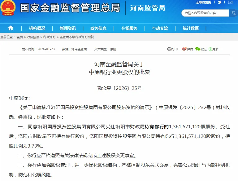 一、同意洛阳国晟投资控股集团有限公司受让洛阳市财政局持有你行的1,361,571,120股股份。受让后,洛阳市财政局不再持有你行股份,洛阳国晟投资控股集团有限公司持有你行1,361,571,120股股份,持股比例为3.73%。