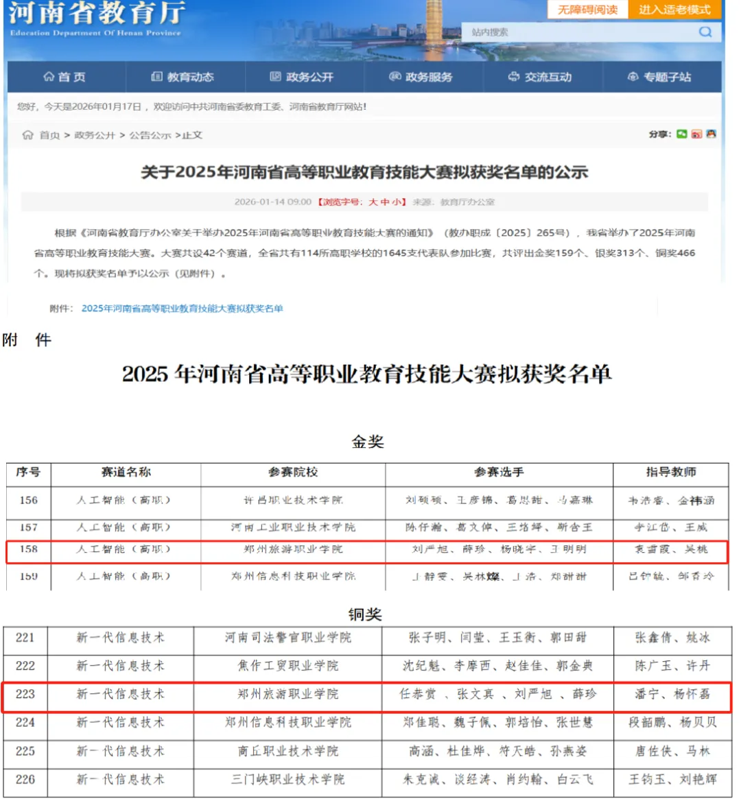 近日,河南省教育厅下发了《关于2025年河南省高等职业教育技能大赛拟获奖名单的公示》(教办职成〔2025〕265号)文件,信息工程学院代表队凭借扎实的专业技能与稳健的现场发挥,在两大技术赛道中斩获佳绩,分别荣获人工智能(高职)赛道金奖与新一代信息技术赛道铜奖,充分彰显了我院在信息技术领域的教学实力与人才培养质量。