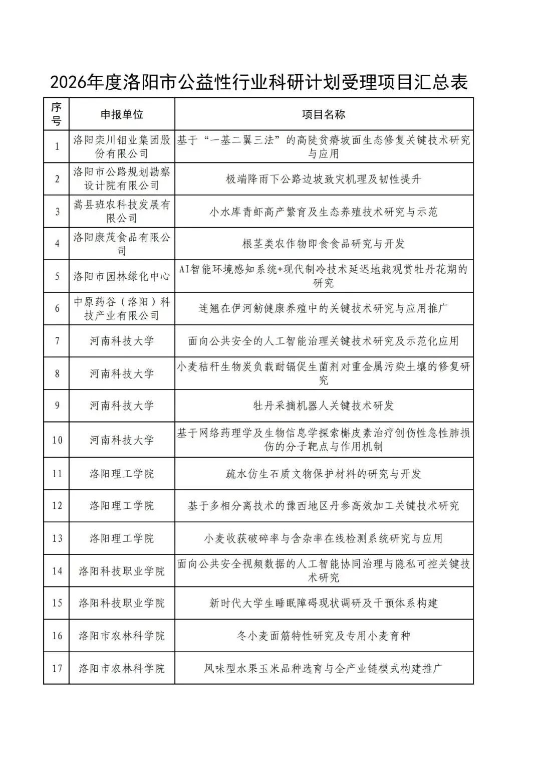 >洛阳市科技局公布2026年度洛阳市公益性行业科研计划项目受理名单