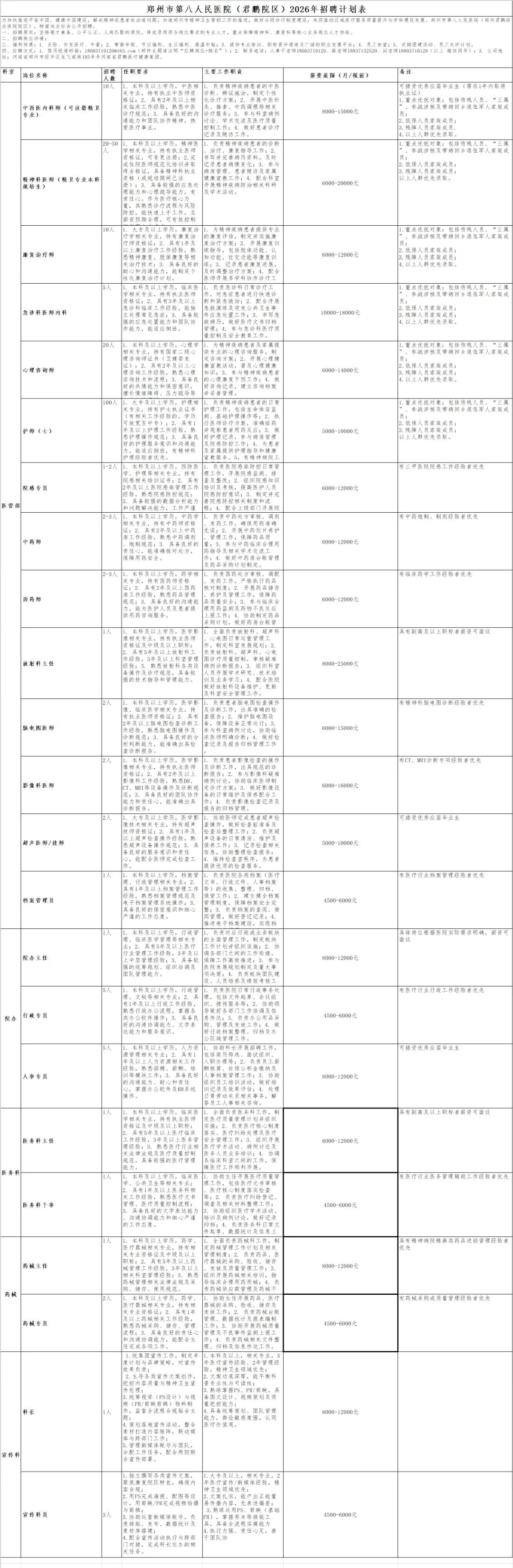在精神卫生领域,每一份坚守都能点亮希望之光,每一次付出都能守护家庭幸福。郑州市第八人民医院(君鹏院区)期待与心怀仁心、术有专攻的你并肩,以专业之力筑牢区域精神健康防线,共赴健康中国建设新征程!1、郑州市第八人民医院、郑州君鹏综合医院(院区)2026年招聘计划表免责声明:本公众号推送稿件部分图片/文字均来自网络及各大主流媒体等网络公开渠道,本公众号引用仅作为相关公益招聘宣传,非商业用途。版权归原作者所有,如认为内容侵权,请联系删除。
