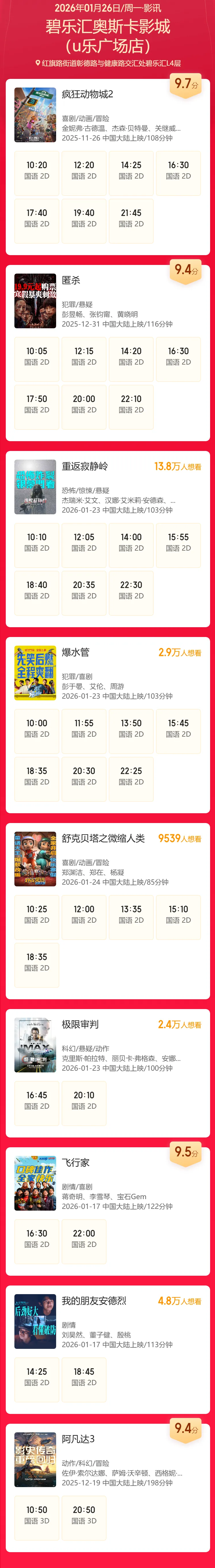 安阳碧乐汇奥斯卡影城1月26日影讯(影讯仅供参考,具体排片以影院当日播出为准)