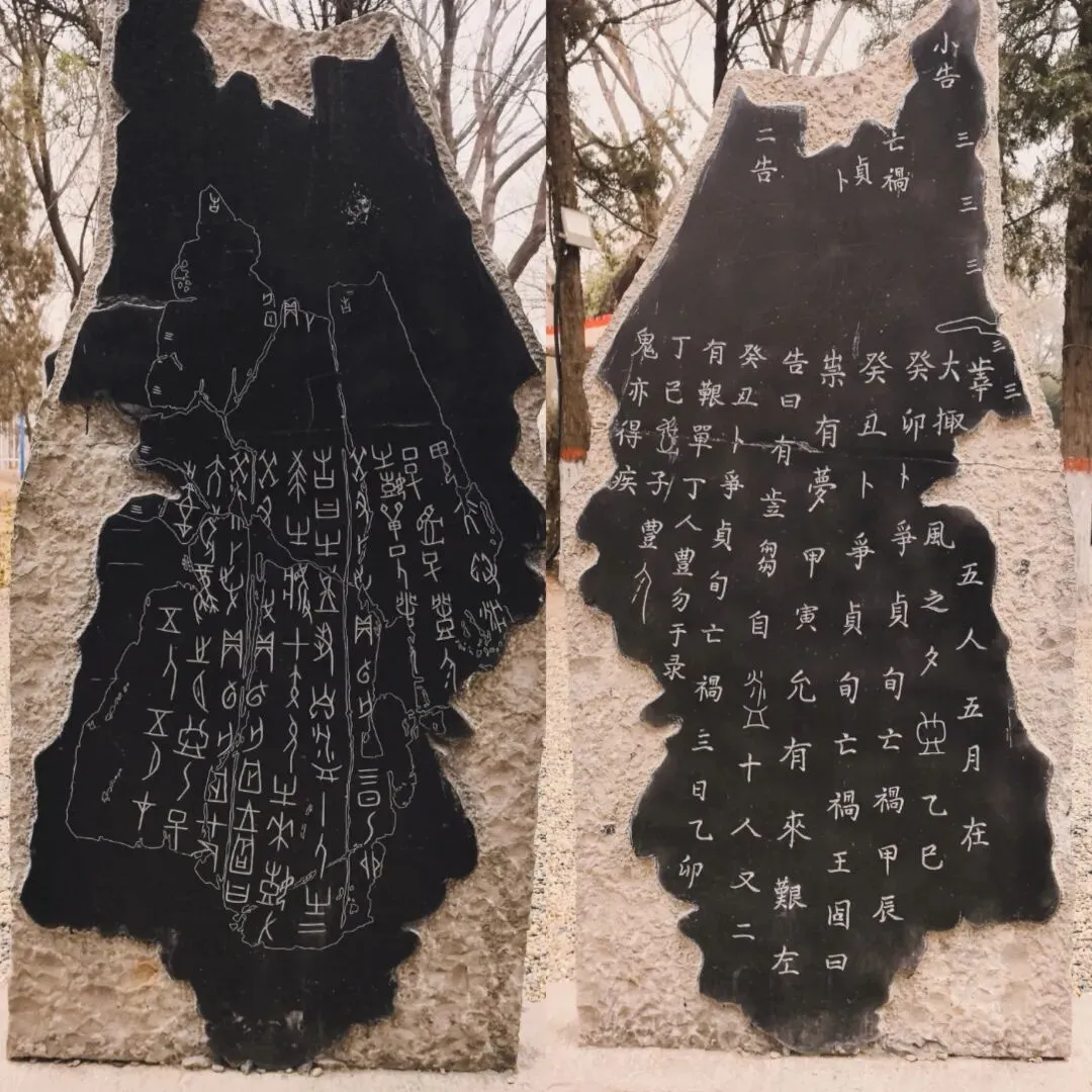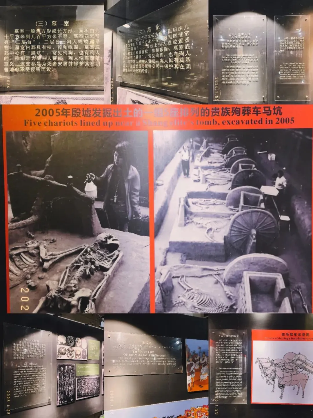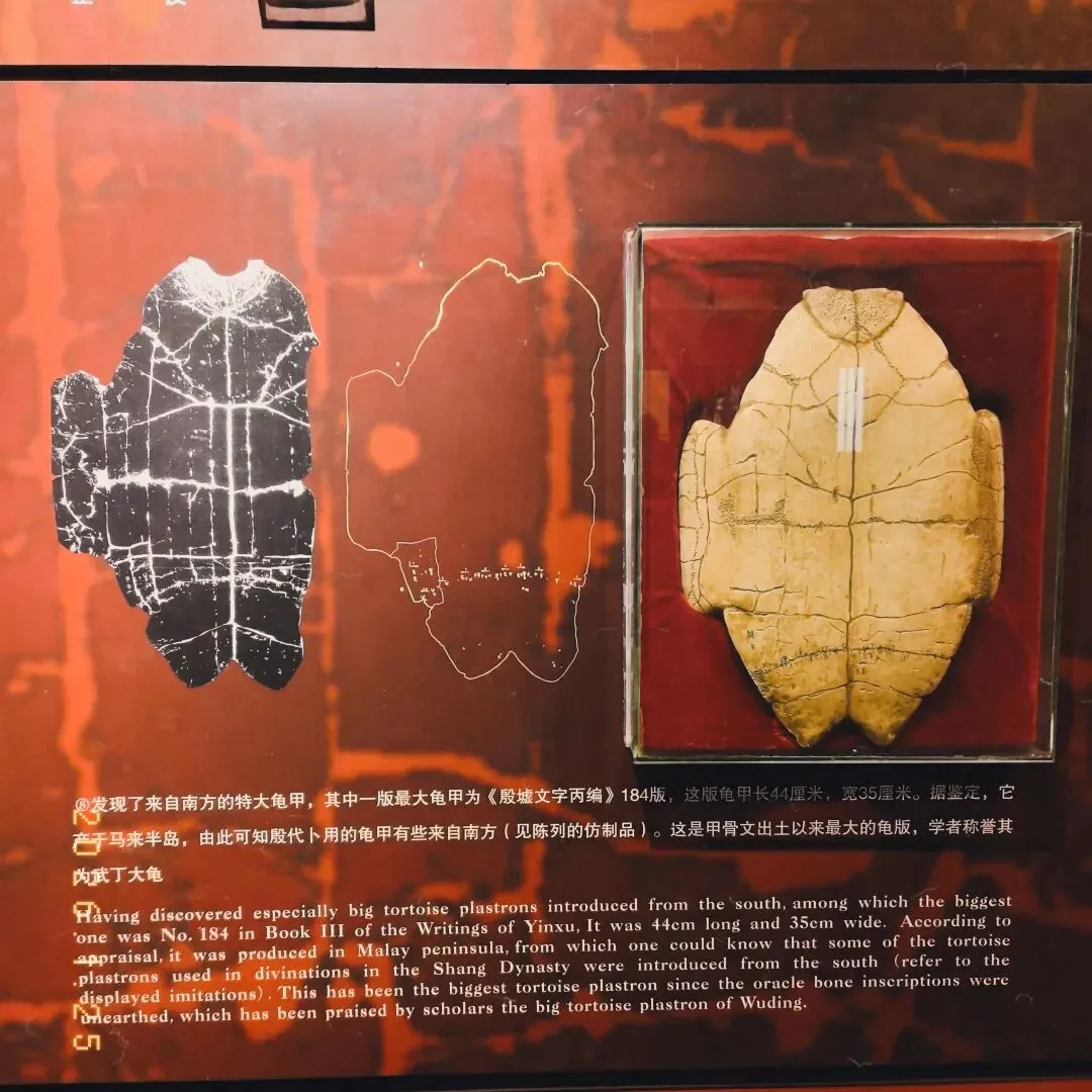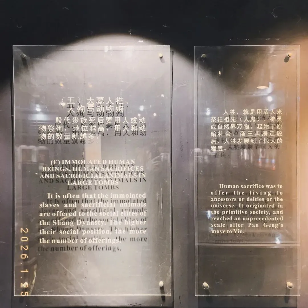 但我之前也说过,三千多年前,我们现在所谓的道德标准,不是他们的对错准绳。在不少地方,做一些大型的工程时,还保有奠基的祭杀仪式。只是祭杀的对象,是动物罢了。其实这是一种人类自蒙昧时代以来,与自然互动惯性的遗存。也形成了中国人的一部分性格特征——做很多事都觉得“没那么简单的,总要付出点代价才安心。”墓坑中仍保有白骨,肉眼可见,还能想象当时他匍匐殉葬的模样,辨别出他/她的身量。《翦商》里面说,商朝的人殉,不仅杀匈奴、平民,也杀贵族和亲信的人。因为有时候他们觉得,杀重要或亲信的人,能显示出对祭祀和神的尊崇,可备一说。但如果这样,也真是令人难忍。王陵内还有专门的獸祭坑。透过玻璃,能看到三千多年前的模样。那时候估计河南气候温和,所以能看到大象(见下图,也被献祭了)。一个人走在王陵遗址内,看到还有很多正处于考古阶段的棚子,或许再过几年来,展区和考古成果都会变得更多吧。其实网上说宫殿宗庙基址不值得去,但因为这两个地方联票没法单买,所以就买都买了,去去吧。打了好久的车才打到,上车了,司机也不招呼。我报出手机尾号,他也不理我,还很酷,把把手机递给我输入。因为昨晚打车遇到一个服务态度很差的司机,导致我有点ptsd,觉得这司机在摆谱(王陵遗址很偏,这种派单估计司机接了都有气)。车开动了,他不说话,我也没说话。我已经开始生气了。一下子有点内疚,搜了一下抖音的手语课,学了一个“谢谢”的手势(竖起大拇指,指头屈点两下)。下车的时候,伸出手,对他比划了一下然后准备走。看了我的手势,他突然“啊啊”喊住我,拿出自己的手机,点开聊天记录,我看他的最近联系人是老婆,心想他应该很频繁跟老婆互动吧。他指了指“你有票!”三字,再次跟我确认是否真的有票。我突然意识到他听不见,一时不知道怎么表达,只能点头示意。不知道他是真的想帮我免费,还是想有偿服务。我宁愿认为他是看到我对他说谢谢,想帮我。宫殿宗庙遗址确实可逛的不多,很多东西都已经迁移到大邑商了。考古是一件旷日持久的战争。用自己的一生去清理远古的遗存,以时间换时间。所以看到几位前辈的信件,想像他们穷尽岁月沉醉于甲骨学术,为文化存续和溯源孜孜不倦时,打心眼里敬佩。我做不了这样的人,但我感谢国家和社会上有这样的人。正反两面刻了甲骨文和今文,很有趣。我在这里琢磨了一会儿,肚子饿了,才动身外出。如果说要给感兴趣的伙伴们贡献一点旅游攻略的话,我的建议是大部分人只用去殷墟博物馆就够了。那里整合了很多展品资源,车粼粼马萧萧区域也有殉葬遗迹可看。王陵遗址,更多是一种对远古的凭吊。如果对殷商的历史知之不深,也调动不起想象力和文化的共鸣(这是文科狗擅长的),那也可以不来。至于宫殿遗址博物馆,只能说平平淡淡吧,难怪卖联票,不然估计没人来。但我在网上看到一种说法,意思是宫殿宗庙遗址以前用玻璃罩的方式展示了很多人殉坑,但是游客投诉过于血腥,于去年下半年回填土盖住看不见了。我觉得投诉血腥的人真是无聊,不爱看可以不来,干嘛让我们这种好奇心中的人啥也看不着。