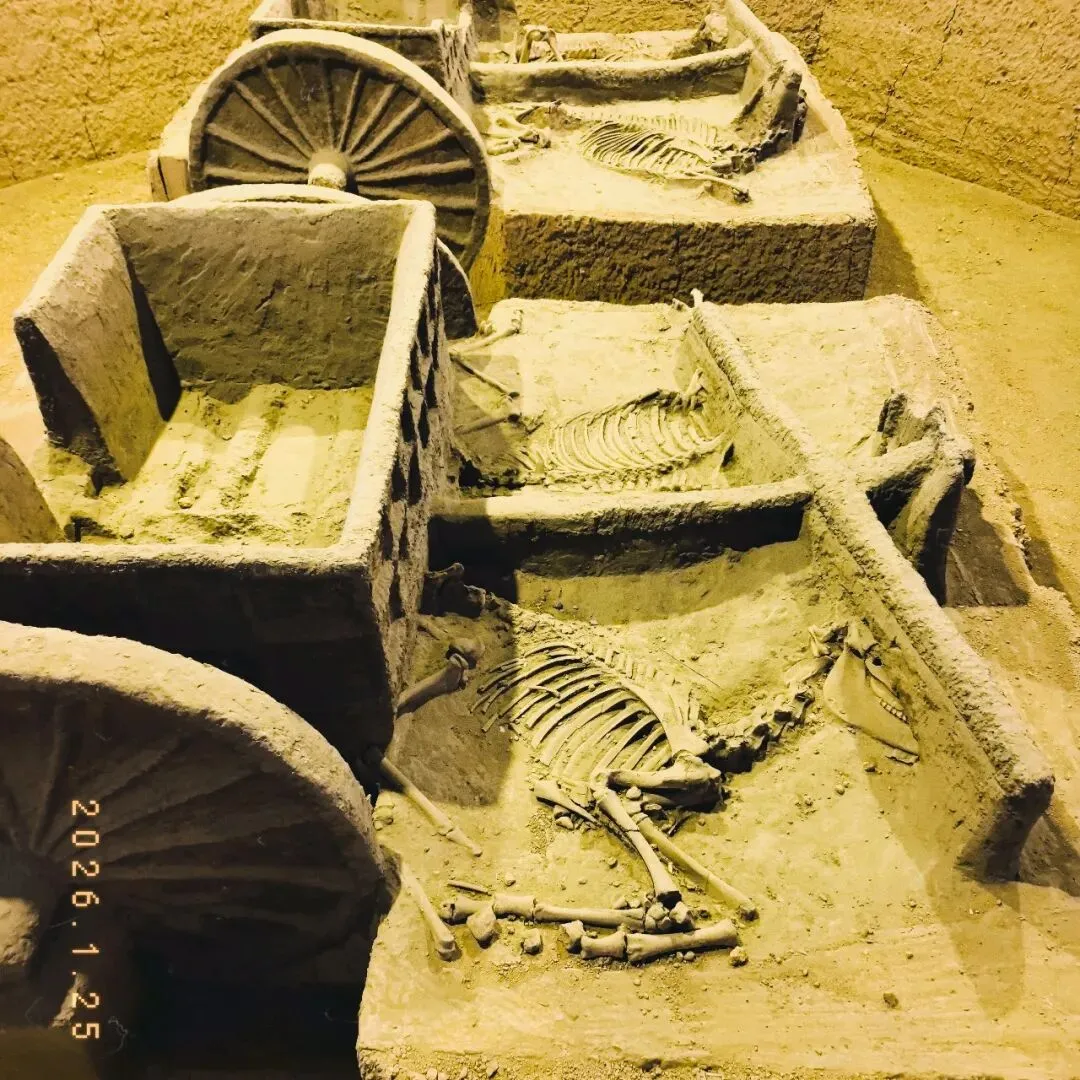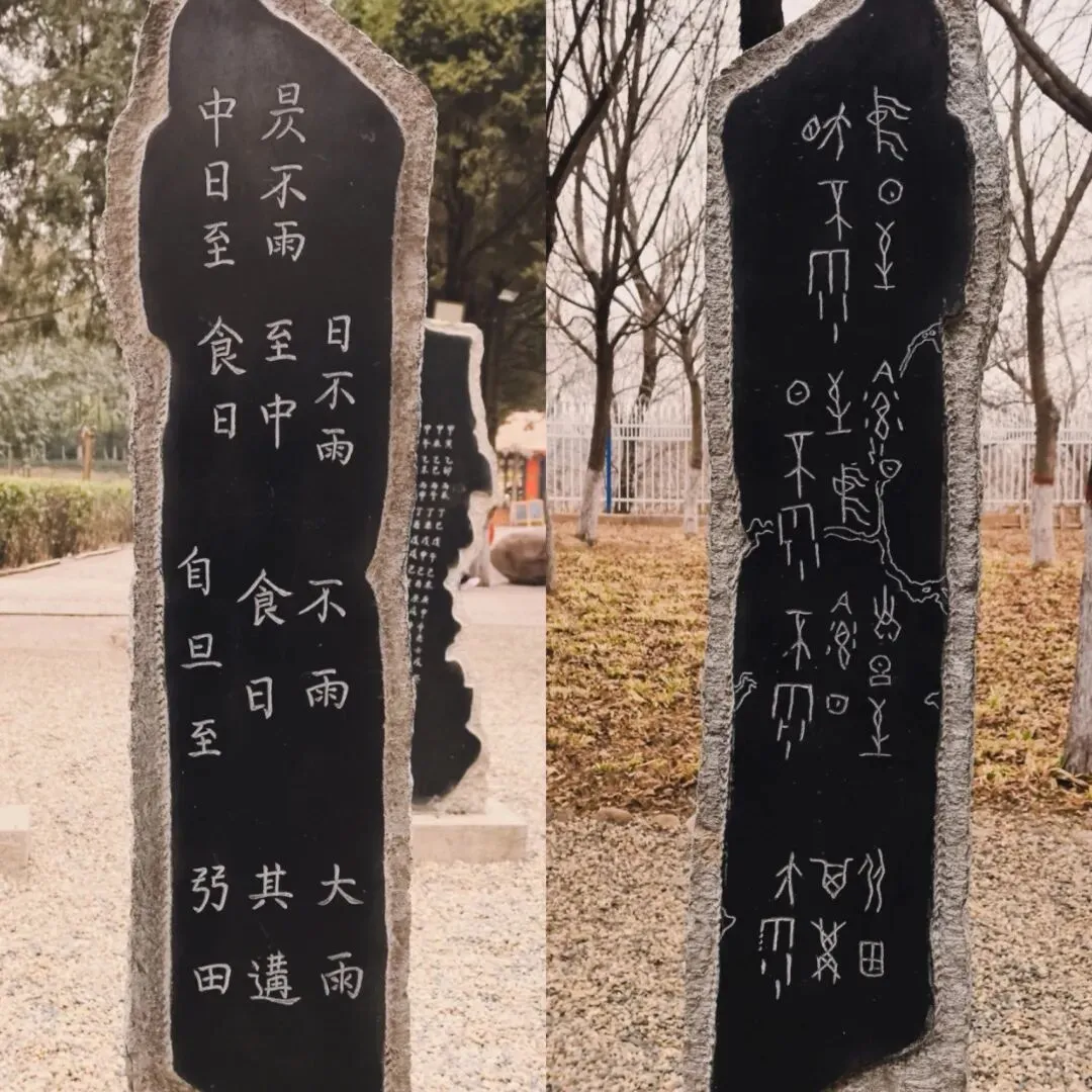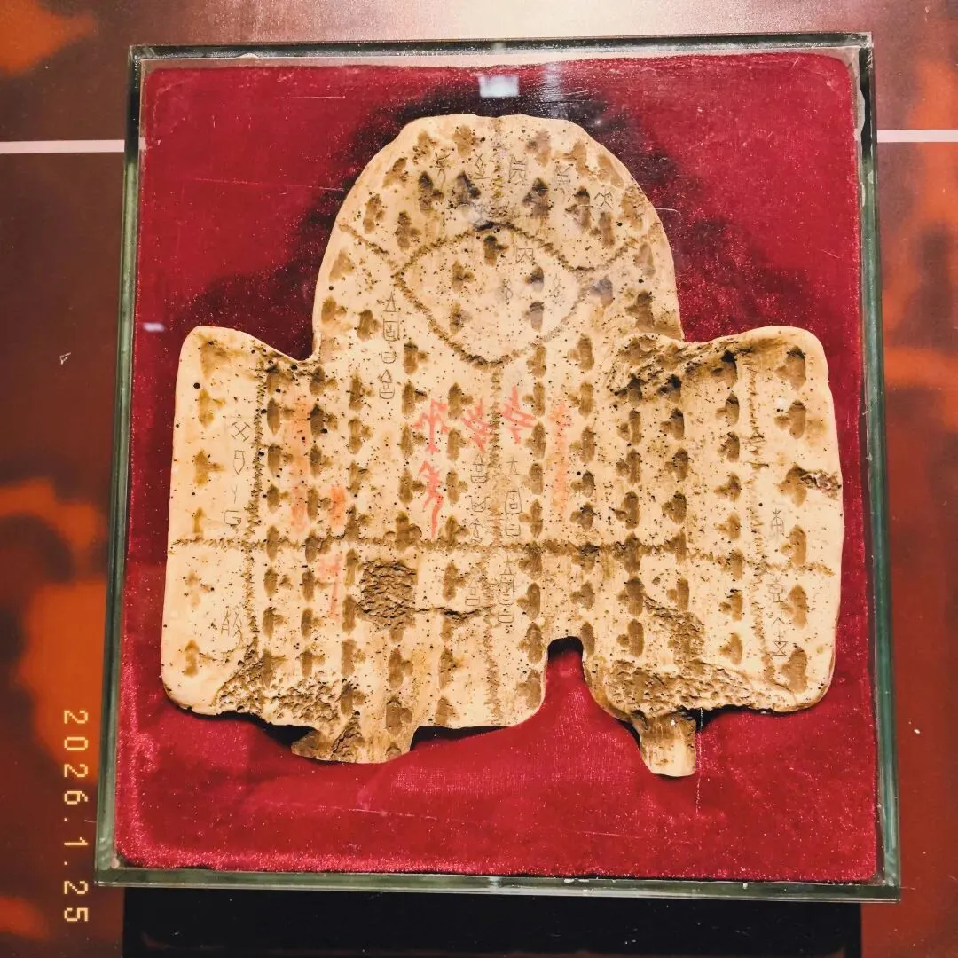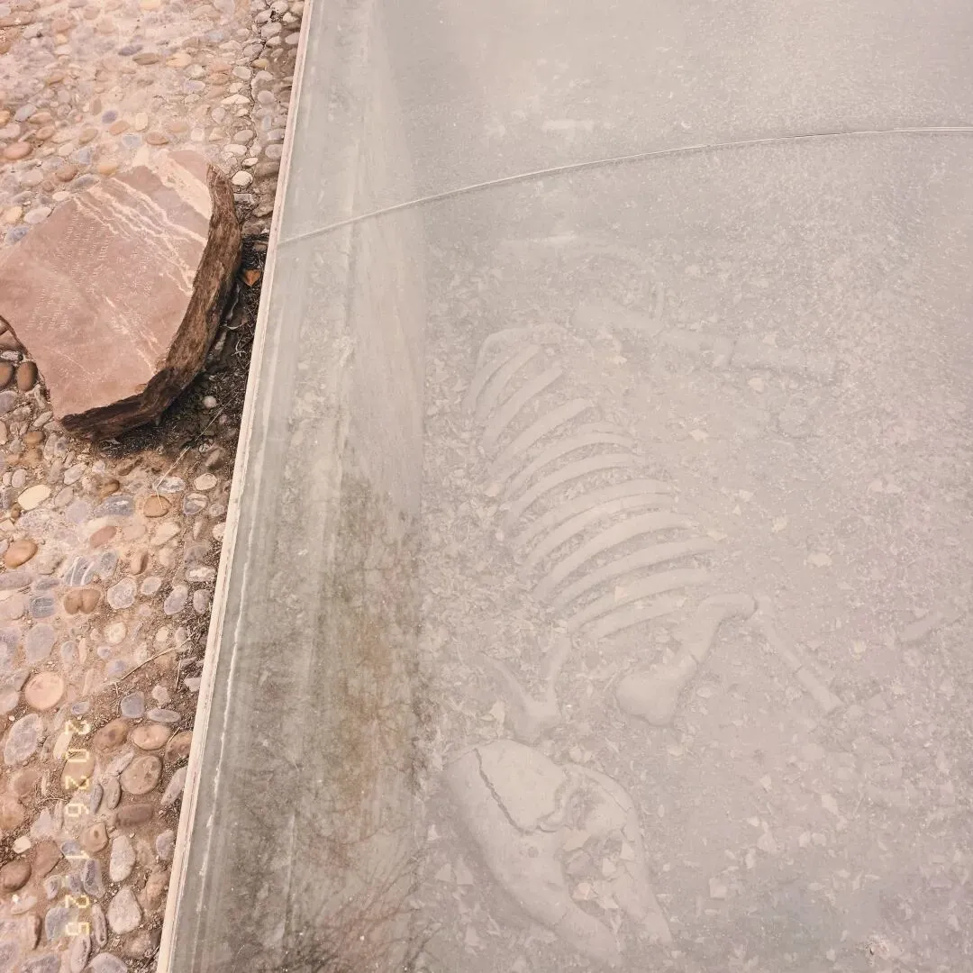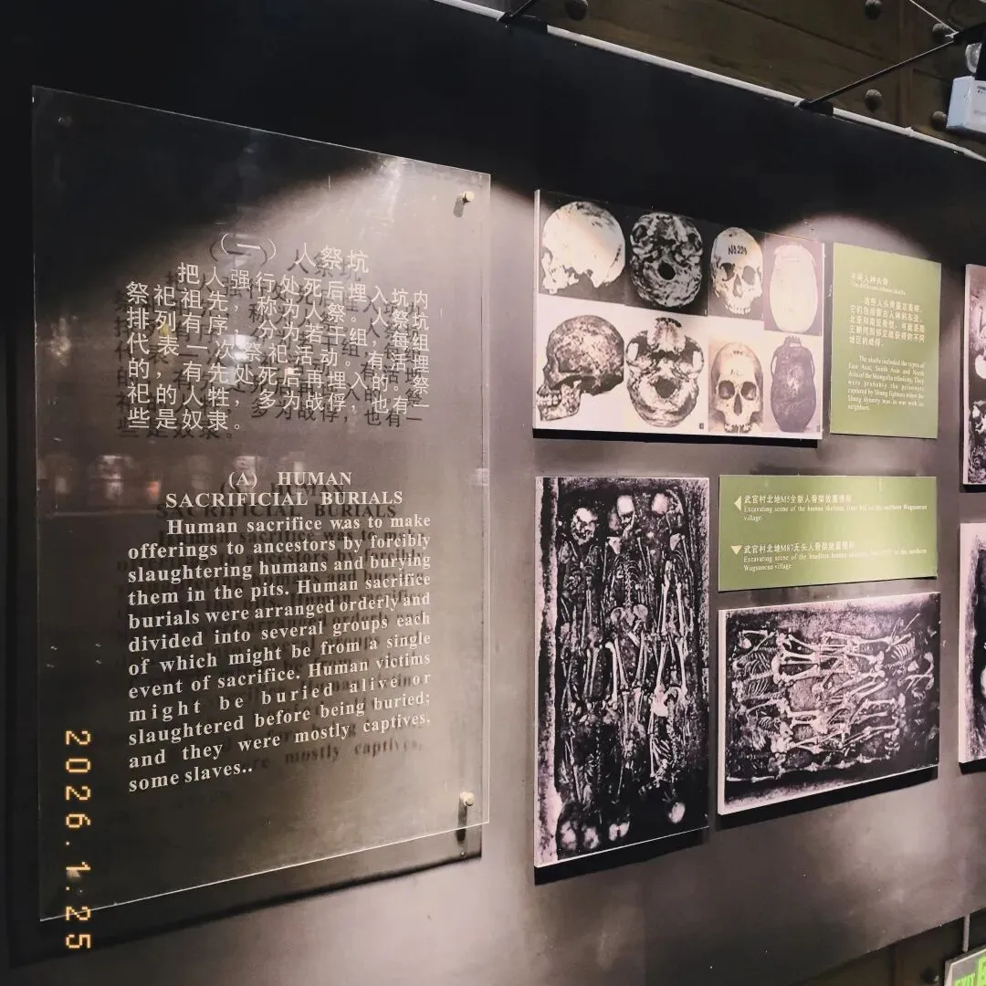 但我之前也说过,三千多年前,我们现在所谓的道德标准,不是他们的对错准绳。在不少地方,做一些大型的工程时,还保有奠基的祭杀仪式。只是祭杀的对象,是动物罢了。其实这是一种人类自蒙昧时代以来,与自然互动惯性的遗存。也形成了中国人的一部分性格特征——做很多事都觉得“没那么简单的,总要付出点代价才安心。”墓坑中仍保有白骨,肉眼可见,还能想象当时他匍匐殉葬的模样,辨别出他/她的身量。《翦商》里面说,商朝的人殉,不仅杀匈奴、平民,也杀贵族和亲信的人。因为有时候他们觉得,杀重要或亲信的人,能显示出对祭祀和神的尊崇,可备一说。但如果这样,也真是令人难忍。王陵内还有专门的獸祭坑。透过玻璃,能看到三千多年前的模样。那时候估计河南气候温和,所以能看到大象(见下图,也被献祭了)。一个人走在王陵遗址内,看到还有很多正处于考古阶段的棚子,或许再过几年来,展区和考古成果都会变得更多吧。其实网上说宫殿宗庙基址不值得去,但因为这两个地方联票没法单买,所以就买都买了,去去吧。打了好久的车才打到,上车了,司机也不招呼。我报出手机尾号,他也不理我,还很酷,把把手机递给我输入。因为昨晚打车遇到一个服务态度很差的司机,导致我有点ptsd,觉得这司机在摆谱(王陵遗址很偏,这种派单估计司机接了都有气)。车开动了,他不说话,我也没说话。我已经开始生气了。一下子有点内疚,搜了一下抖音的手语课,学了一个“谢谢”的手势(竖起大拇指,指头屈点两下)。下车的时候,伸出手,对他比划了一下然后准备走。看了我的手势,他突然“啊啊”喊住我,拿出自己的手机,点开聊天记录,我看他的最近联系人是老婆,心想他应该很频繁跟老婆互动吧。他指了指“你有票!”三字,再次跟我确认是否真的有票。我突然意识到他听不见,一时不知道怎么表达,只能点头示意。不知道他是真的想帮我免费,还是想有偿服务。我宁愿认为他是看到我对他说谢谢,想帮我。宫殿宗庙遗址确实可逛的不多,很多东西都已经迁移到大邑商了。考古是一件旷日持久的战争。用自己的一生去清理远古的遗存,以时间换时间。所以看到几位前辈的信件,想像他们穷尽岁月沉醉于甲骨学术,为文化存续和溯源孜孜不倦时,打心眼里敬佩。我做不了这样的人,但我感谢国家和社会上有这样的人。正反两面刻了甲骨文和今文,很有趣。我在这里琢磨了一会儿,肚子饿了,才动身外出。如果说要给感兴趣的伙伴们贡献一点旅游攻略的话,我的建议是大部分人只用去殷墟博物馆就够了。那里整合了很多展品资源,车粼粼马萧萧区域也有殉葬遗迹可看。王陵遗址,更多是一种对远古的凭吊。如果对殷商的历史知之不深,也调动不起想象力和文化的共鸣(这是文科狗擅长的),那也可以不来。至于宫殿遗址博物馆,只能说平平淡淡吧,难怪卖联票,不然估计没人来。但我在网上看到一种说法,意思是宫殿宗庙遗址以前用玻璃罩的方式展示了很多人殉坑,但是游客投诉过于血腥,于去年下半年回填土盖住看不见了。我觉得投诉血腥的人真是无聊,不爱看可以不来,干嘛让我们这种好奇心中的人啥也看不着。