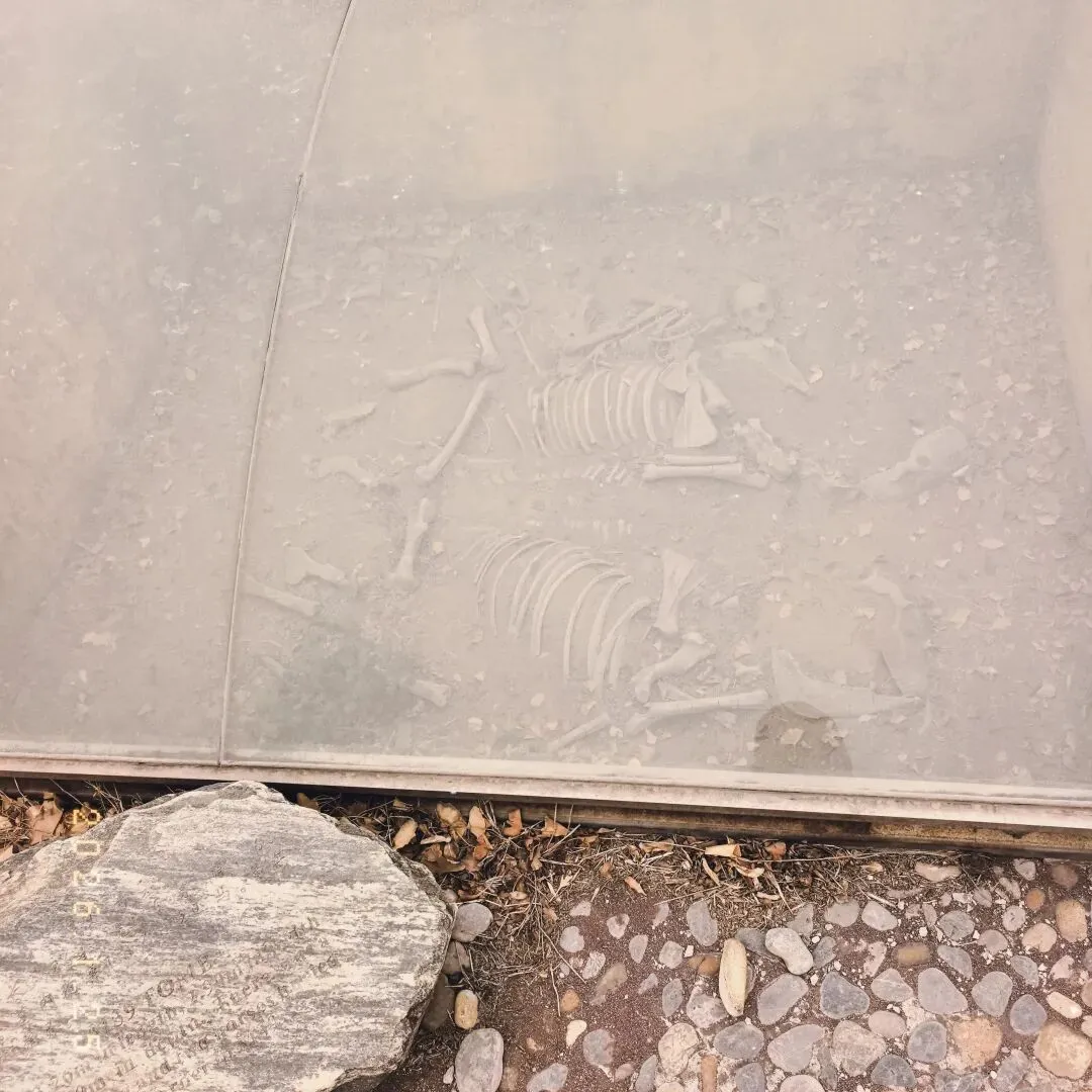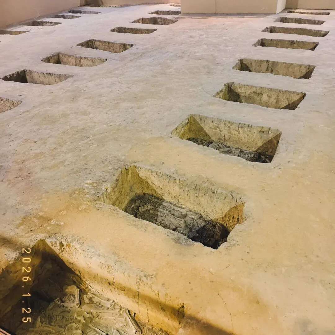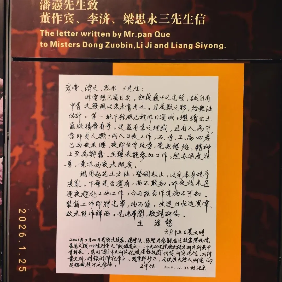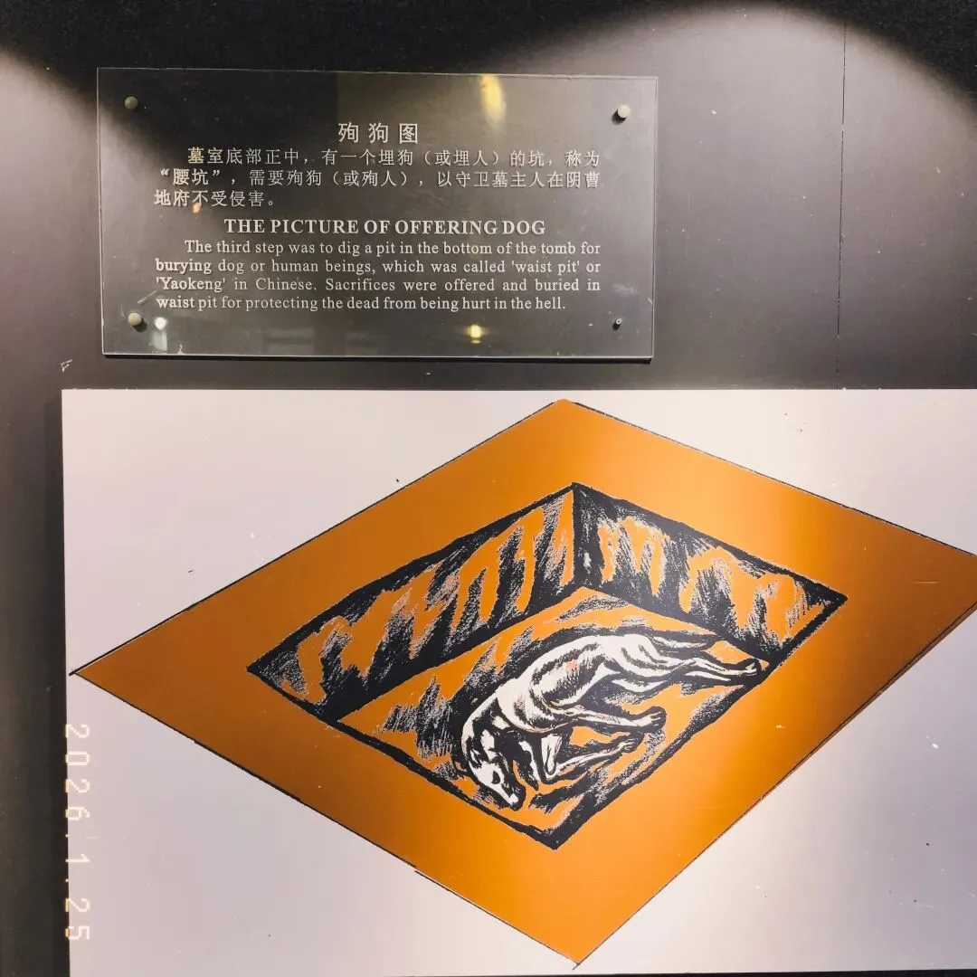 但我之前也说过,三千多年前,我们现在所谓的道德标准,不是他们的对错准绳。在不少地方,做一些大型的工程时,还保有奠基的祭杀仪式。只是祭杀的对象,是动物罢了。其实这是一种人类自蒙昧时代以来,与自然互动惯性的遗存。也形成了中国人的一部分性格特征——做很多事都觉得“没那么简单的,总要付出点代价才安心。”墓坑中仍保有白骨,肉眼可见,还能想象当时他匍匐殉葬的模样,辨别出他/她的身量。《翦商》里面说,商朝的人殉,不仅杀匈奴、平民,也杀贵族和亲信的人。因为有时候他们觉得,杀重要或亲信的人,能显示出对祭祀和神的尊崇,可备一说。但如果这样,也真是令人难忍。王陵内还有专门的獸祭坑。透过玻璃,能看到三千多年前的模样。那时候估计河南气候温和,所以能看到大象(见下图,也被献祭了)。一个人走在王陵遗址内,看到还有很多正处于考古阶段的棚子,或许再过几年来,展区和考古成果都会变得更多吧。其实网上说宫殿宗庙基址不值得去,但因为这两个地方联票没法单买,所以就买都买了,去去吧。打了好久的车才打到,上车了,司机也不招呼。我报出手机尾号,他也不理我,还很酷,把把手机递给我输入。因为昨晚打车遇到一个服务态度很差的司机,导致我有点ptsd,觉得这司机在摆谱(王陵遗址很偏,这种派单估计司机接了都有气)。车开动了,他不说话,我也没说话。我已经开始生气了。一下子有点内疚,搜了一下抖音的手语课,学了一个“谢谢”的手势(竖起大拇指,指头屈点两下)。下车的时候,伸出手,对他比划了一下然后准备走。看了我的手势,他突然“啊啊”喊住我,拿出自己的手机,点开聊天记录,我看他的最近联系人是老婆,心想他应该很频繁跟老婆互动吧。他指了指“你有票!”三字,再次跟我确认是否真的有票。我突然意识到他听不见,一时不知道怎么表达,只能点头示意。不知道他是真的想帮我免费,还是想有偿服务。我宁愿认为他是看到我对他说谢谢,想帮我。宫殿宗庙遗址确实可逛的不多,很多东西都已经迁移到大邑商了。考古是一件旷日持久的战争。用自己的一生去清理远古的遗存,以时间换时间。所以看到几位前辈的信件,想像他们穷尽岁月沉醉于甲骨学术,为文化存续和溯源孜孜不倦时,打心眼里敬佩。我做不了这样的人,但我感谢国家和社会上有这样的人。正反两面刻了甲骨文和今文,很有趣。我在这里琢磨了一会儿,肚子饿了,才动身外出。如果说要给感兴趣的伙伴们贡献一点旅游攻略的话,我的建议是大部分人只用去殷墟博物馆就够了。那里整合了很多展品资源,车粼粼马萧萧区域也有殉葬遗迹可看。王陵遗址,更多是一种对远古的凭吊。如果对殷商的历史知之不深,也调动不起想象力和文化的共鸣(这是文科狗擅长的),那也可以不来。至于宫殿遗址博物馆,只能说平平淡淡吧,难怪卖联票,不然估计没人来。但我在网上看到一种说法,意思是宫殿宗庙遗址以前用玻璃罩的方式展示了很多人殉坑,但是游客投诉过于血腥,于去年下半年回填土盖住看不见了。我觉得投诉血腥的人真是无聊,不爱看可以不来,干嘛让我们这种好奇心中的人啥也看不着。