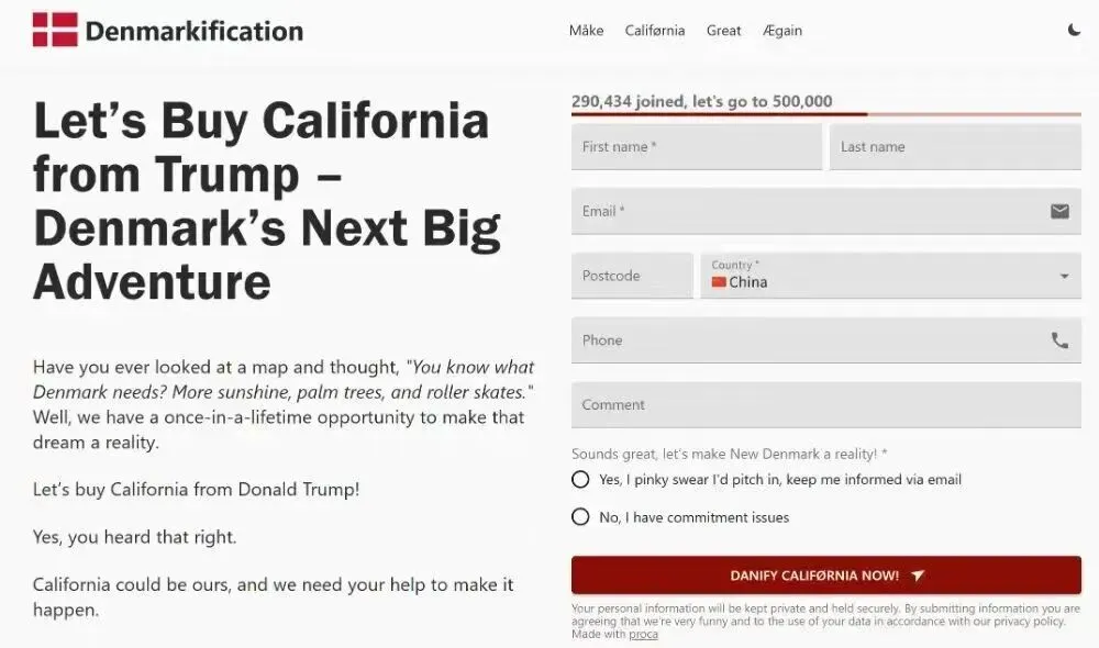 ●近期,美国高层多次公开威胁夺取格陵兰岛。为了还击美国的威胁,近30万网民参与了一份名为“支持丹麦买下美国加州”的联署。最先提出这一创意的是瑞士网友泽维尔·杜瓦特,他和朋友合作搭建了联署网站后,在丹麦获得了广泛支持。