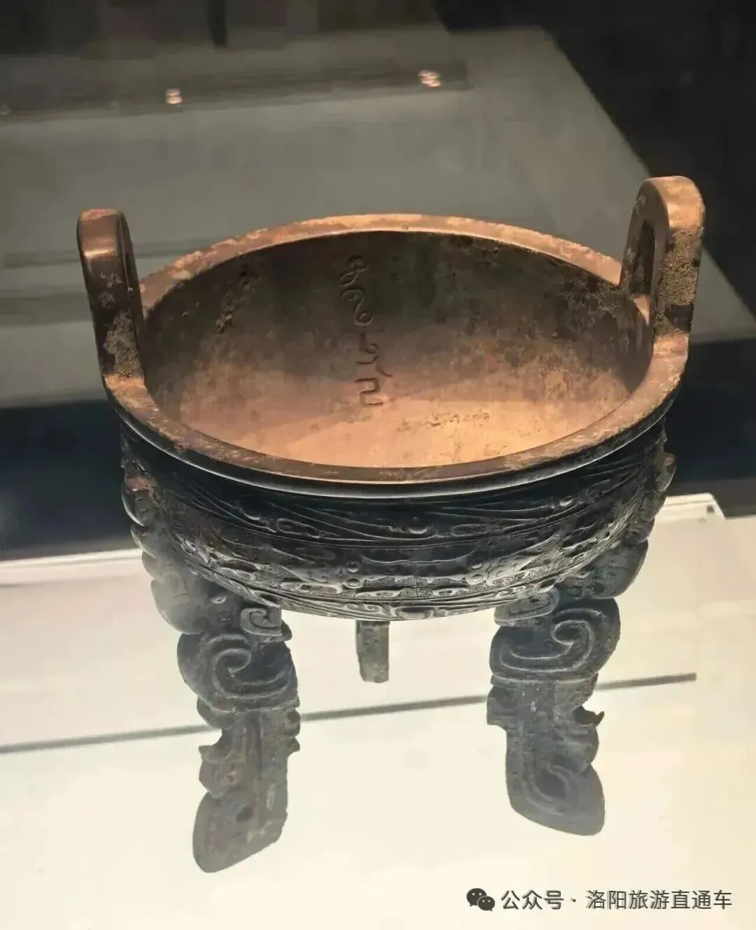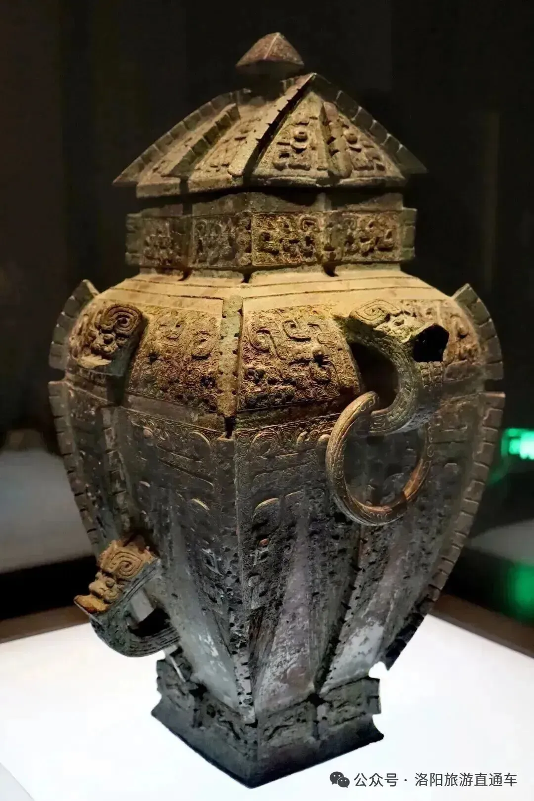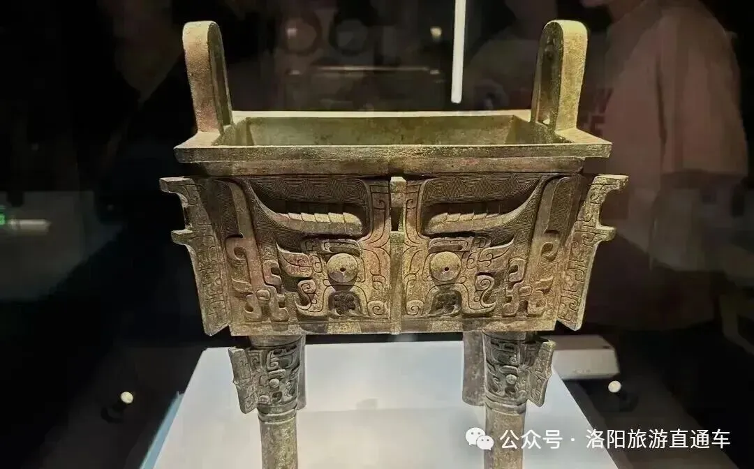 它也被俗称为洛阳鼎,云雷纹打底,正中是怒目圆睁的兽面纹饰。据说它是一件西周的文物,方鼎直腹,深浅浮雕交替,饕鬄巨目狰狞,衬托出王室的尊严,让人想起那句诗:“雄都定鼎地,势据万国尊。”