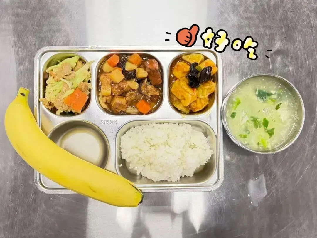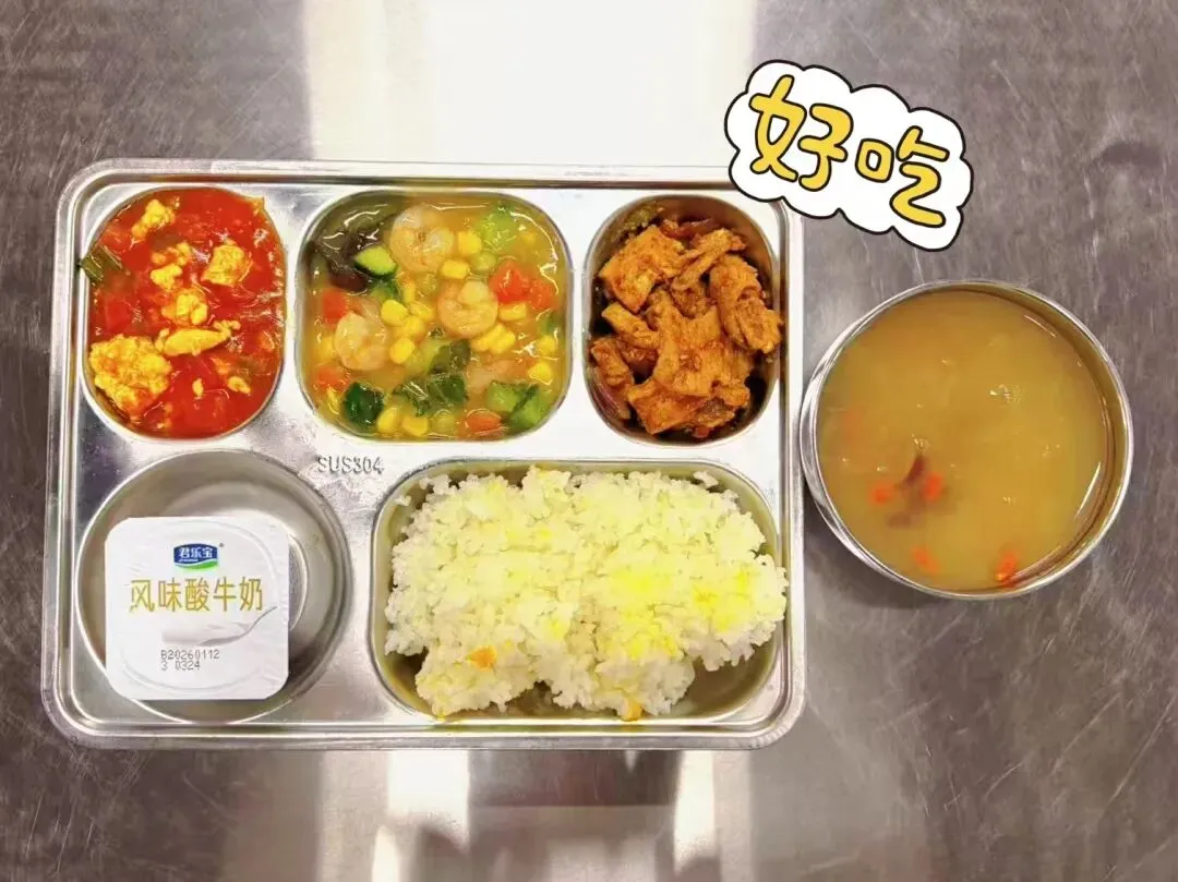 金瓜米饭、五彩炒虾仁、肉片虎皮豆干、番茄炒鸡蛋、银耳水果汤、酸奶