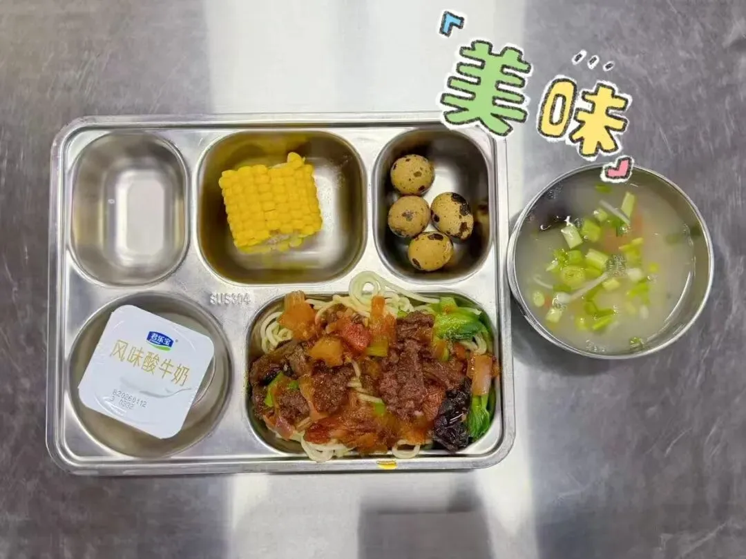 杂粮米饭、番茄炖牛腩、肉片烧地三鲜(汉/清真)、耗油生菜、腊八粥