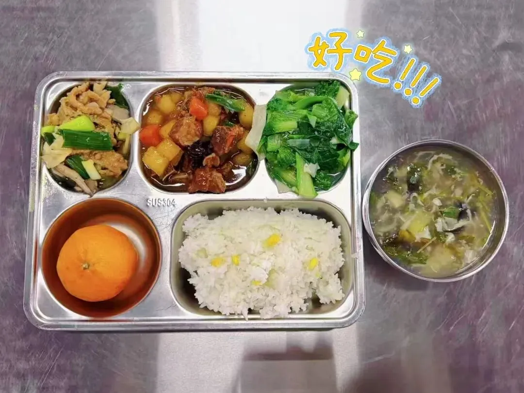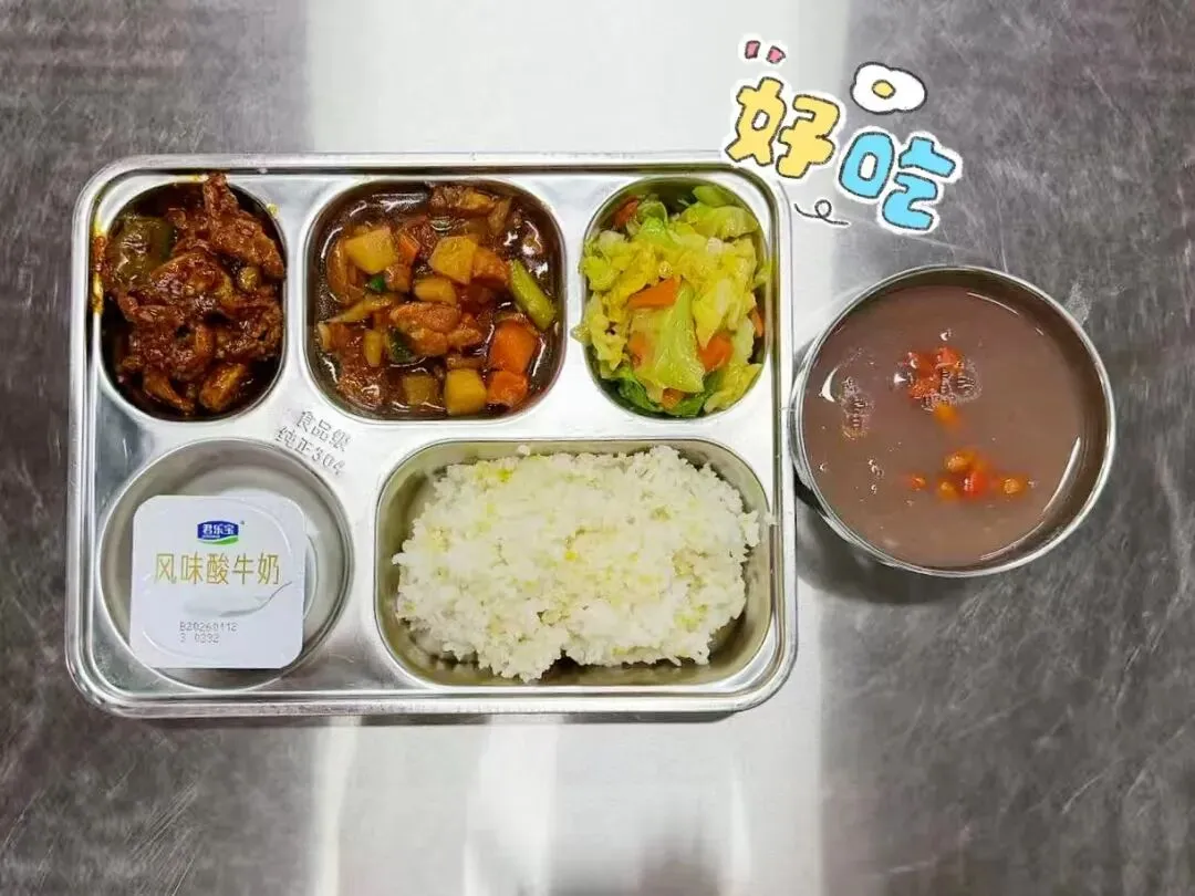 黄金米饭、土豆烧鸡块、孜然面筋烧肉片、豉汁包菜、麦仁红豆汤、酸奶