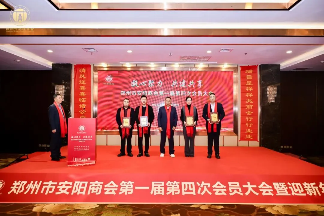 郑州市安阳商会会长谭瑞清为新晋理事单位代表尚永刚、吴现伟、于海旺、高明颁发了牌匾。
