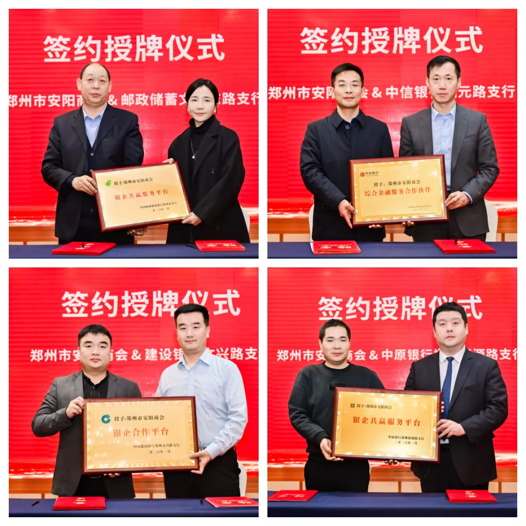 在银行签约仪式环节,郑州市安阳商会副会长兼金融服务部部长宋必成、副会长兼医疗康养部部长唐东峰、副会长兼策划宣传部部长武文岩、副会长兼财税服务部部长分别与邮储银行、中信银行、建设银行、中原银行签约授信,为商会企业搭建起更坚实的金融服务纽带。