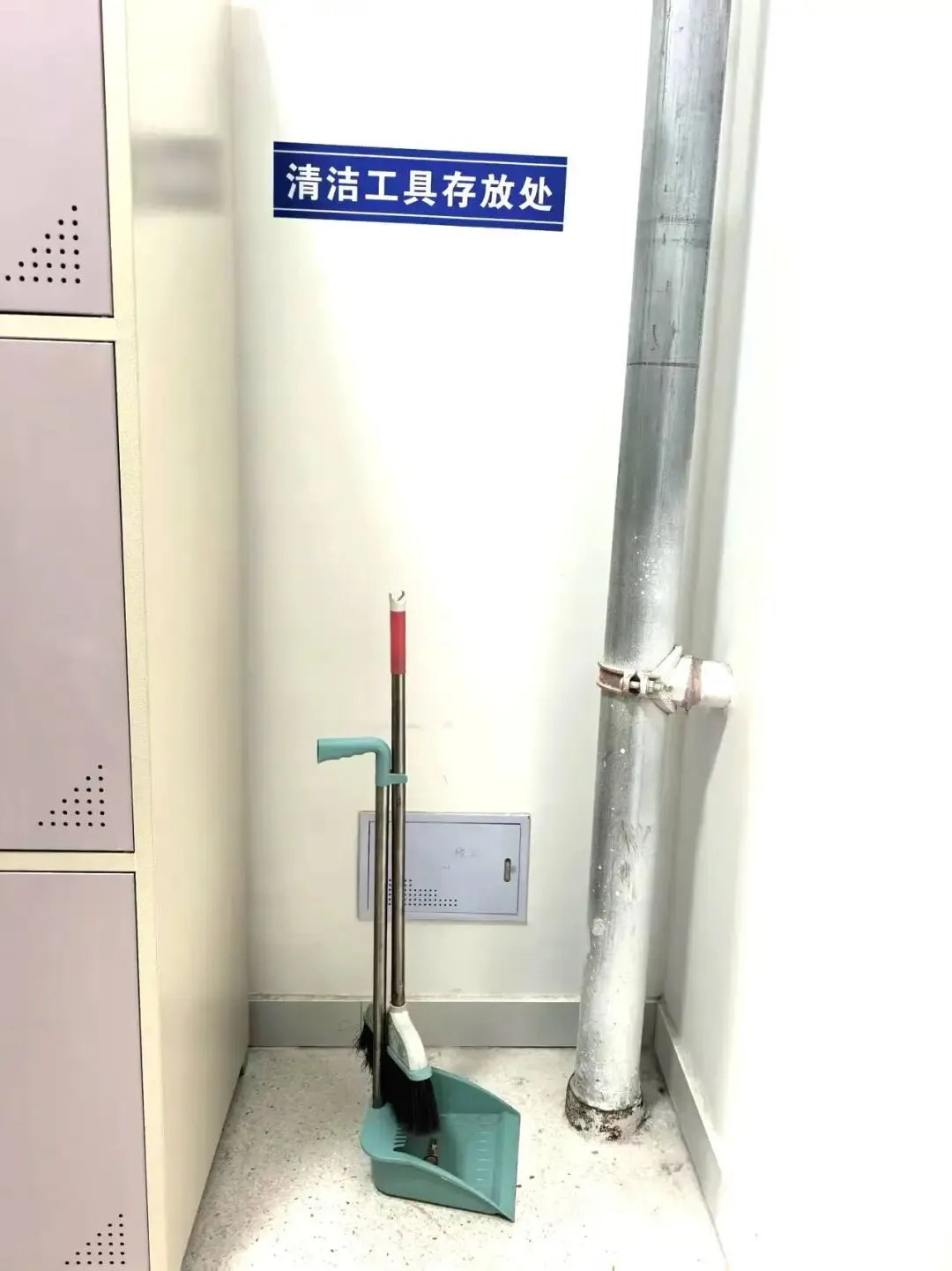 宿舍地面无垃圾、无污渍、无积水,角落无杂物堆积,清洁工具整齐摆放在指定区域。