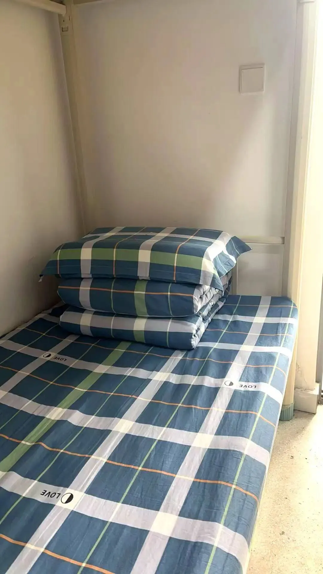 被褥折叠规范、棱角分明,摆放位置统一(靠阳台一侧),床单平整无褶皱,枕头置于被褥上方中央,床面无多余衣物、书籍等杂物。