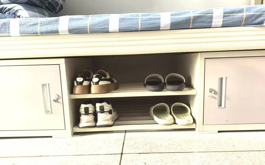 鞋子需按统一朝向(鞋头朝内)整齐排列于床底鞋架,保持鞋身洁净,无杂乱堆放、随意散落现象。