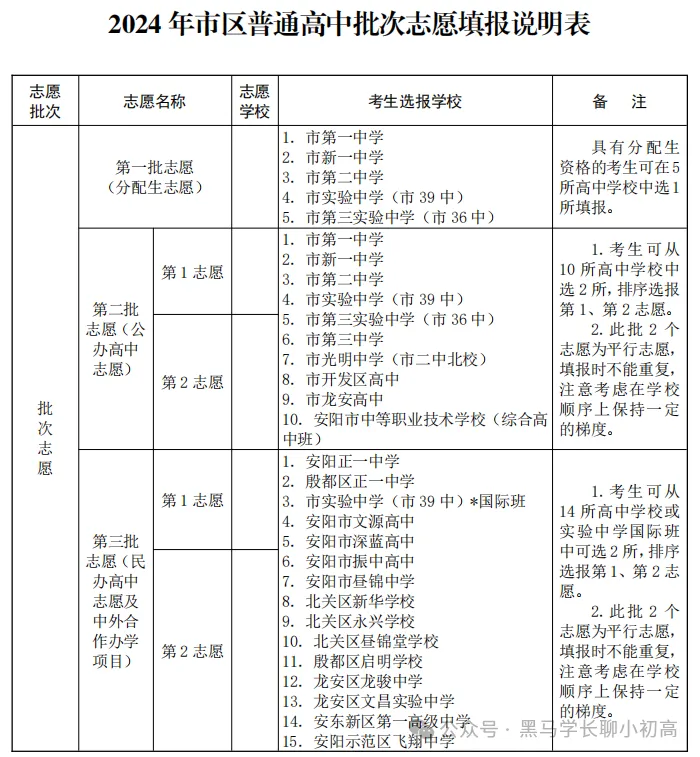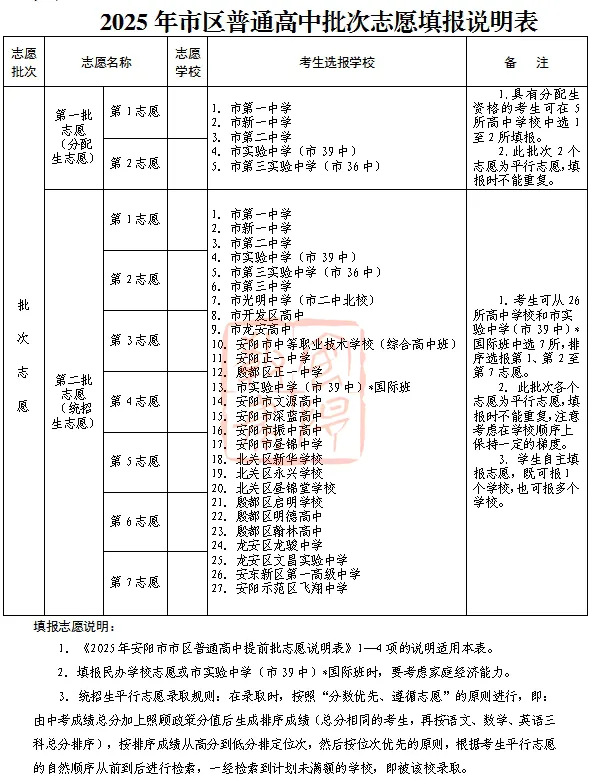 第二批志愿(统招生志愿):共设7个志愿,依次为第1志愿、第2志愿……第7志愿,考生可自主填报1至7个志愿,各个志愿为平行志愿。符合条件的考生可在市第一中学、市新一中学、市第二中学、市实验中学(市39中)、市第三实验中学(市36中)、市第三中学、市光明中学、市开发区高中、市龙安高中、市中等职业技术学校(综合高中班)、安阳正一中学、殷都区正一中学、文源高中、深蓝高中、安阳市振中高中、安阳市昼锦中学、北关区新华学校、北关区永兴学校、北关区昼锦堂学校、殷都区启明学校、殷都区翰林高中、殷都区明德高中、龙安区龙骏中学、龙安区文昌实验中学、安东新区第一高级中学、安阳示范区飞翔中学等26所学校和市实验中学(市39中)*国际班中最多选报7所。