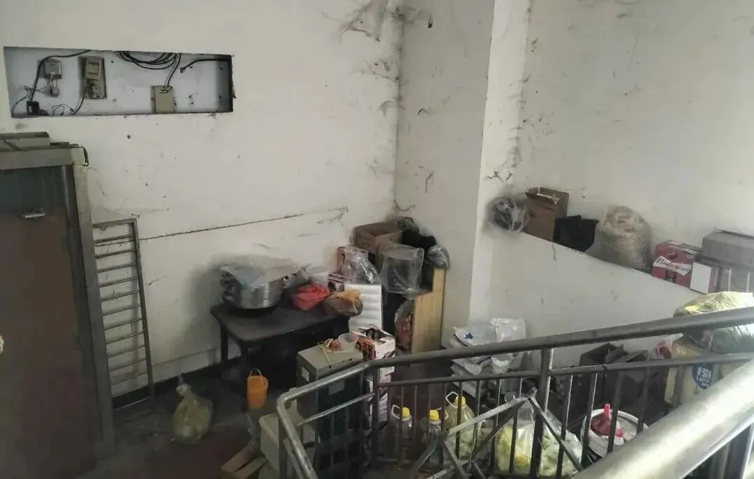 2、店铺西侧负一楼堆放杂物占用疏散楼梯;