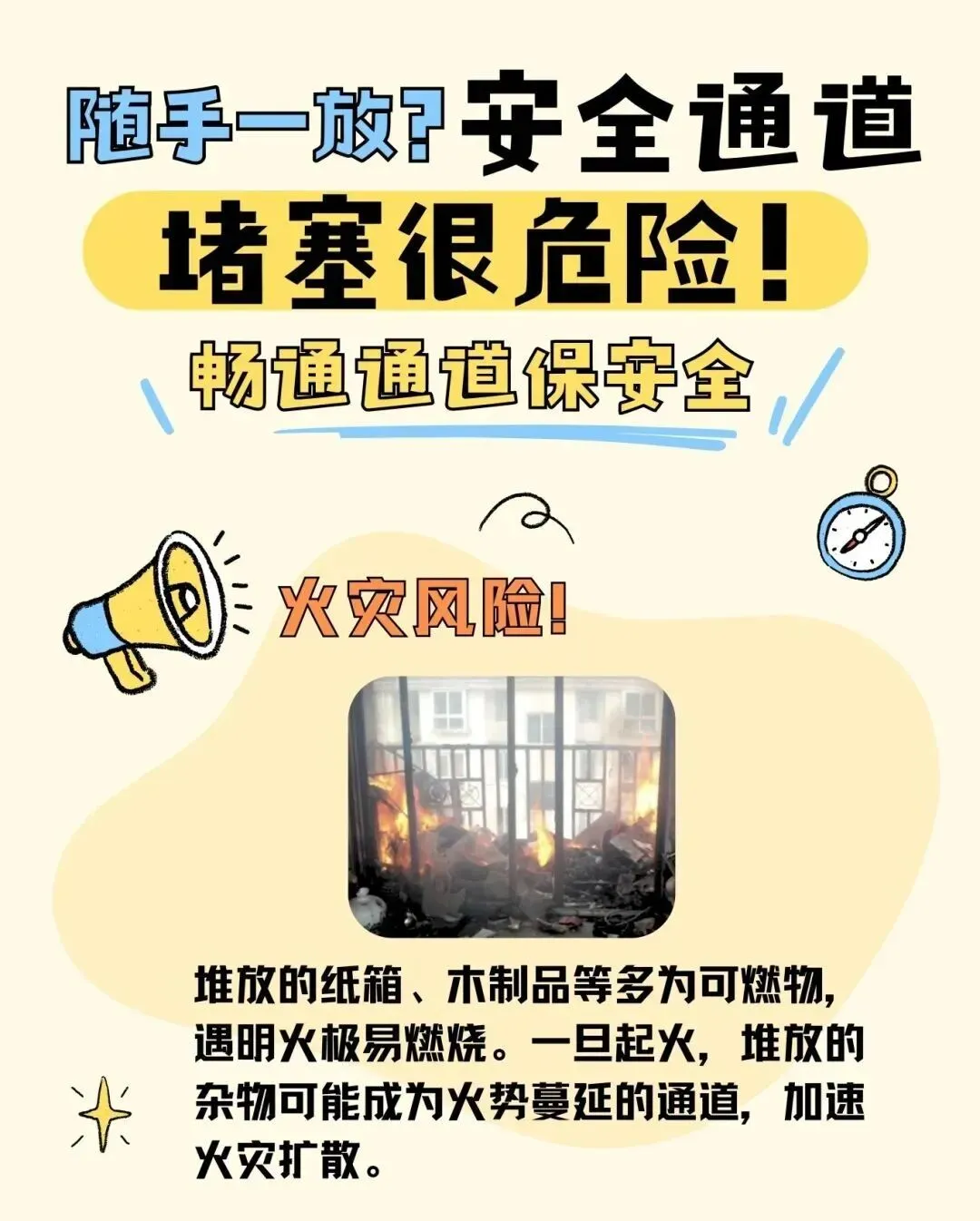 楼道堆放杂物多为木质类、棉织类、纸质类等物品,存放时间越久,稍遇见明火极易引起火灾;楼层停放电瓶车、乱扔烟头等都很容易引起火灾事故的发生。