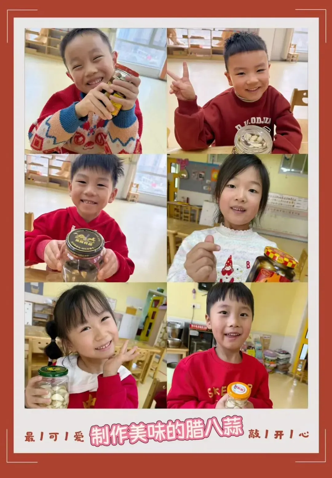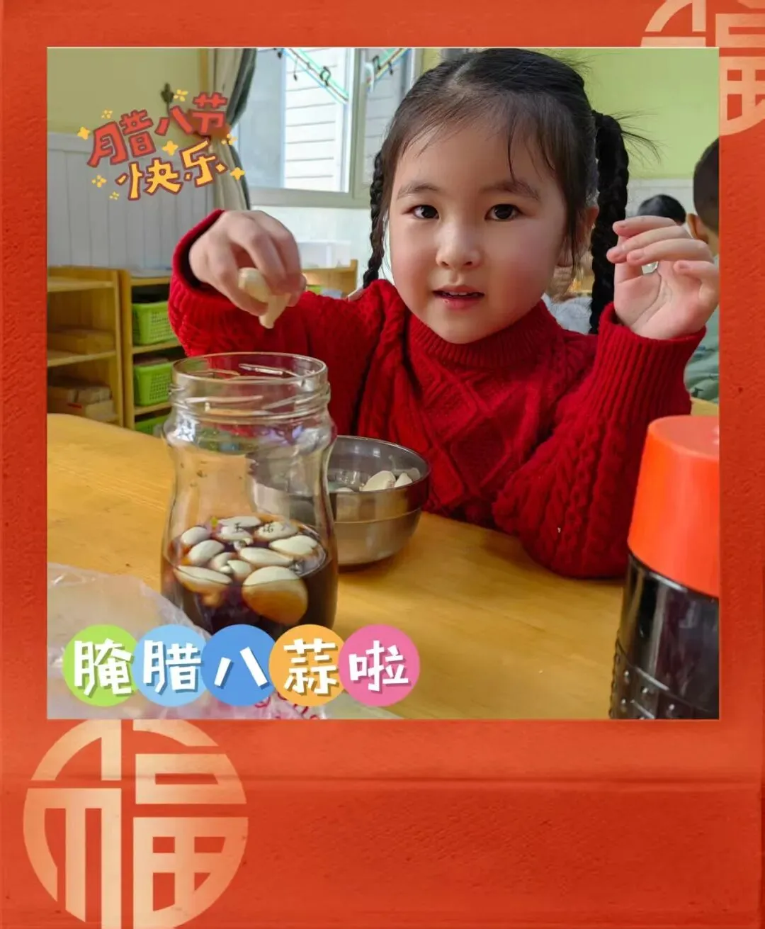 “腊八蒜,绿莹莹,配着饺子香喷喷!”这可是腊八节超有趣的环节!宝贝们和老师一起剥蒜——圆圆的大蒜瓣,白白胖胖,摸起来滑溜溜的,大家小心翼翼地把蒜瓣装进干净的玻璃罐,倒入酸酸的米醋,再撒上几颗甜甜的冰糖,最后拧紧盖子,贴上属于自己的小标签。等到蒜瓣变成碧绿碧绿的样子,吃起来酸甜爽口,配饺子最合适啦!